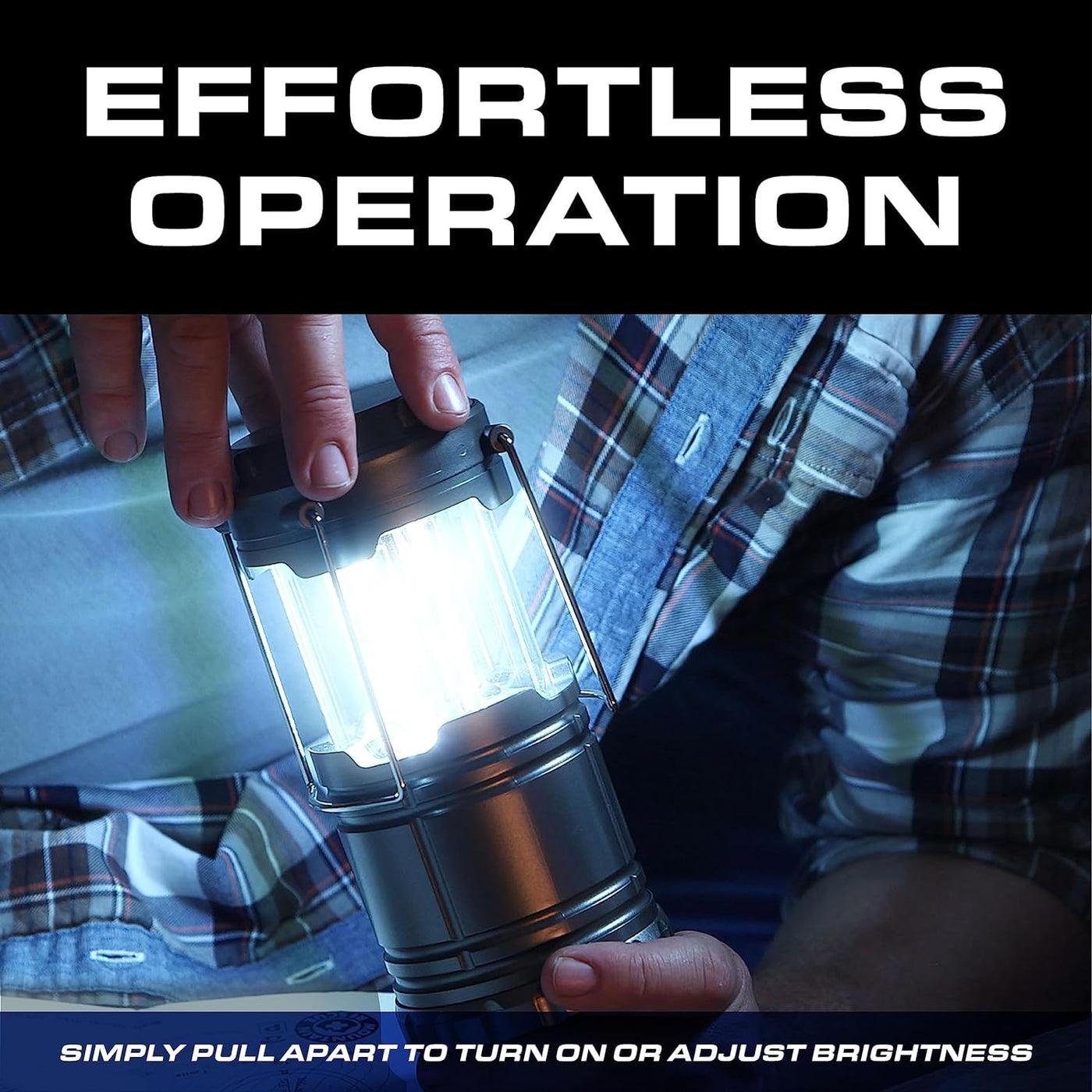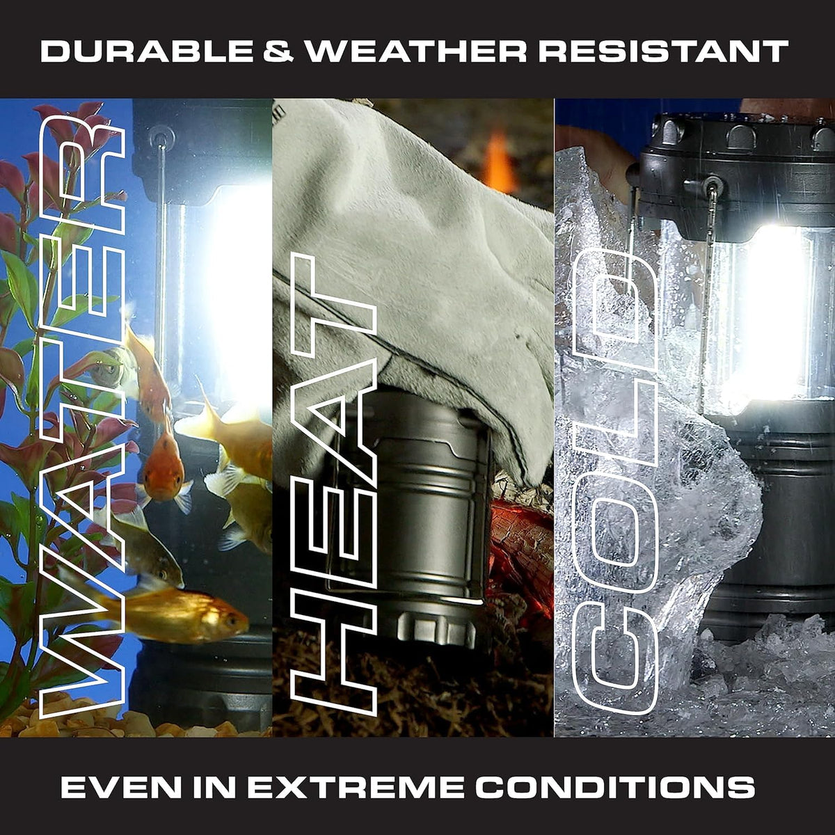 SEEN FROM 2 MILES AWAY: The super bright Taclight Lanterns by Bell+Howell are comprised of energy efficient COB LEDs, bright enough to light up an entire room and able to be seen from up to nautical miles away, making it a seamless substitution for emergency lights, camping lights, and more. Simply pull open the top to activate the light. BATTERY POWERED: Taclight Lanterns are powered by 3x AAA batteries (not included), allowing you to take these lanterns anywhere you like, without the need of a connection to electricity, ensuring TacLanterns will be ready to use during power failures at home or while camping on the go. BUILT TO LAST YEARS: Made from ultra durable, weather resistant, high grade HIPP, Taclight Lanterns are completely waterproof and weatherproof, ensuring each lantern will last for years to come. LIGHTWEIGHT AND PORTABLE: Take the lanterns on camping trips, skiing trips, hikes, or store in case of an emergency with the lightweight and portable design. Each lantern weighs .75 Lbs. and measures 3 x 4 , making it effortless to carry or store. WHAT YOU GET: This set comes with 4 Taclight Lanterns. Store them all around your home in case of emergencies or power outages, or simply take them with you on the go. MEASUREMENTS: Taclight Mini Lanterns weigh .8 pounds and stand 4.25 tall when fully collpased and 6.25 tall when fully extended.
