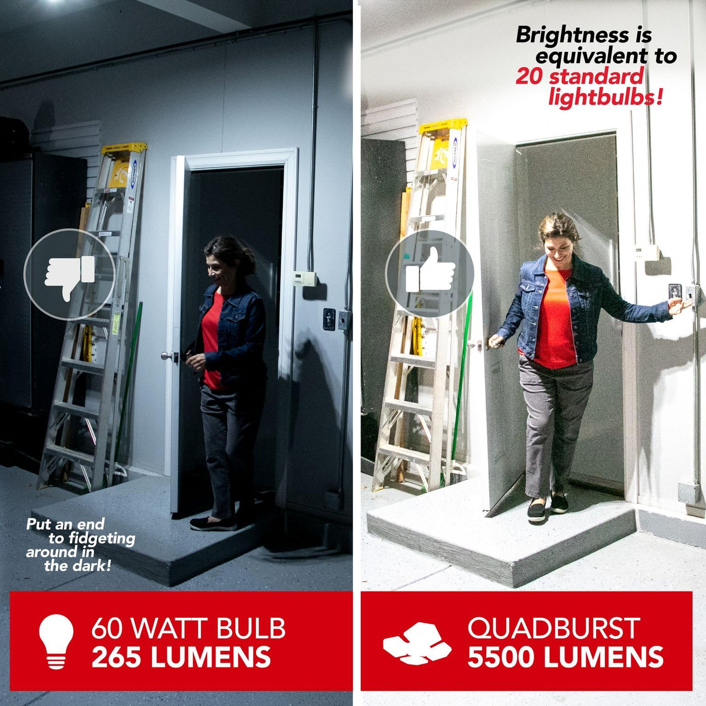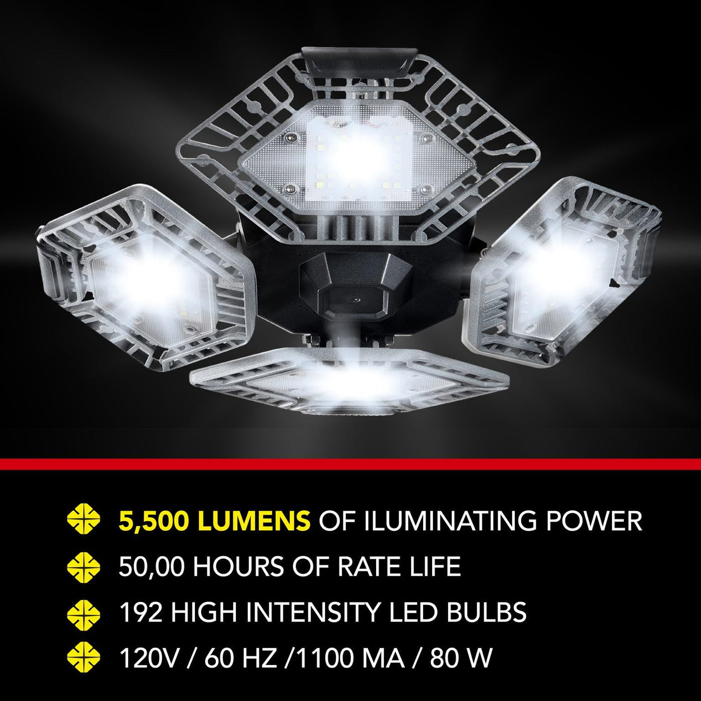 - **Super Bright 5500 Lumens**: Equipped with 192 ultra-bright LED bulbs, the Quadburst delivers a staggering 5500 lumens of illuminating power, capable of lighting up large areas such as warehouses, shops, garages, and living rooms effortlessly.