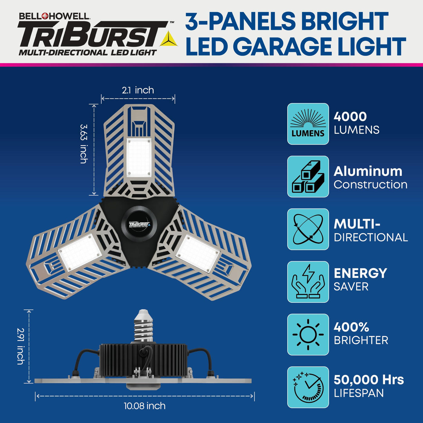 Q: How bright is the Bell+Howell TRIBURST ceiling light?A: The Bell+Howell TRIBURST ceiling light provides an impressive 4000 lumens of brightness, making it 400% brighter than a standard light bulb.