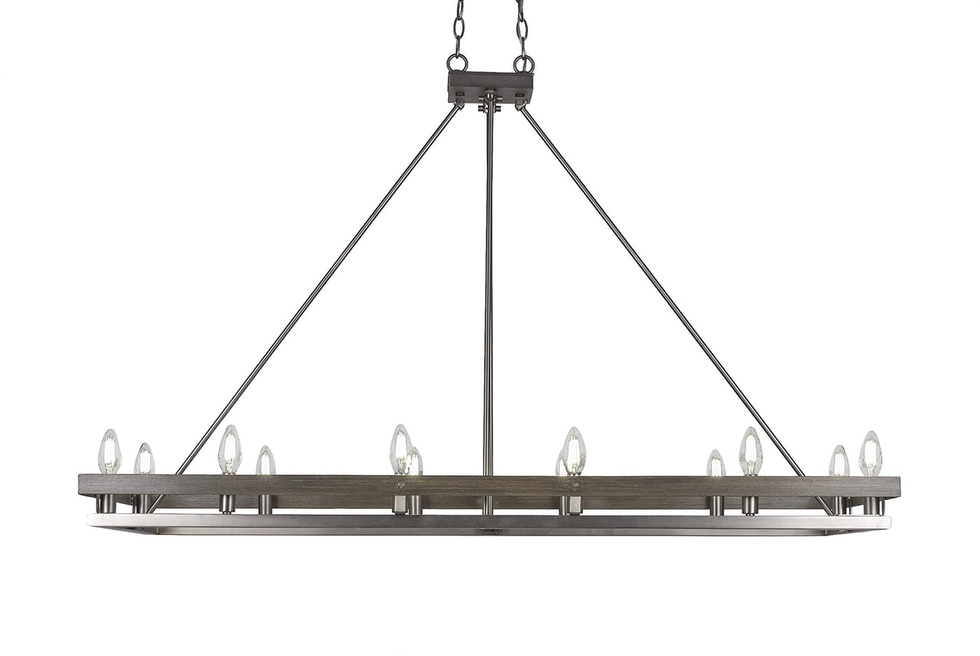 Q: What materials are used in the construction of the Belmont 12 Light Island?A: The Belmont 12 Light Island is constructed from alloy steel, featuring a finish that combines graphite with a painted distressed wood-look, adding a stylish touch to your decor.