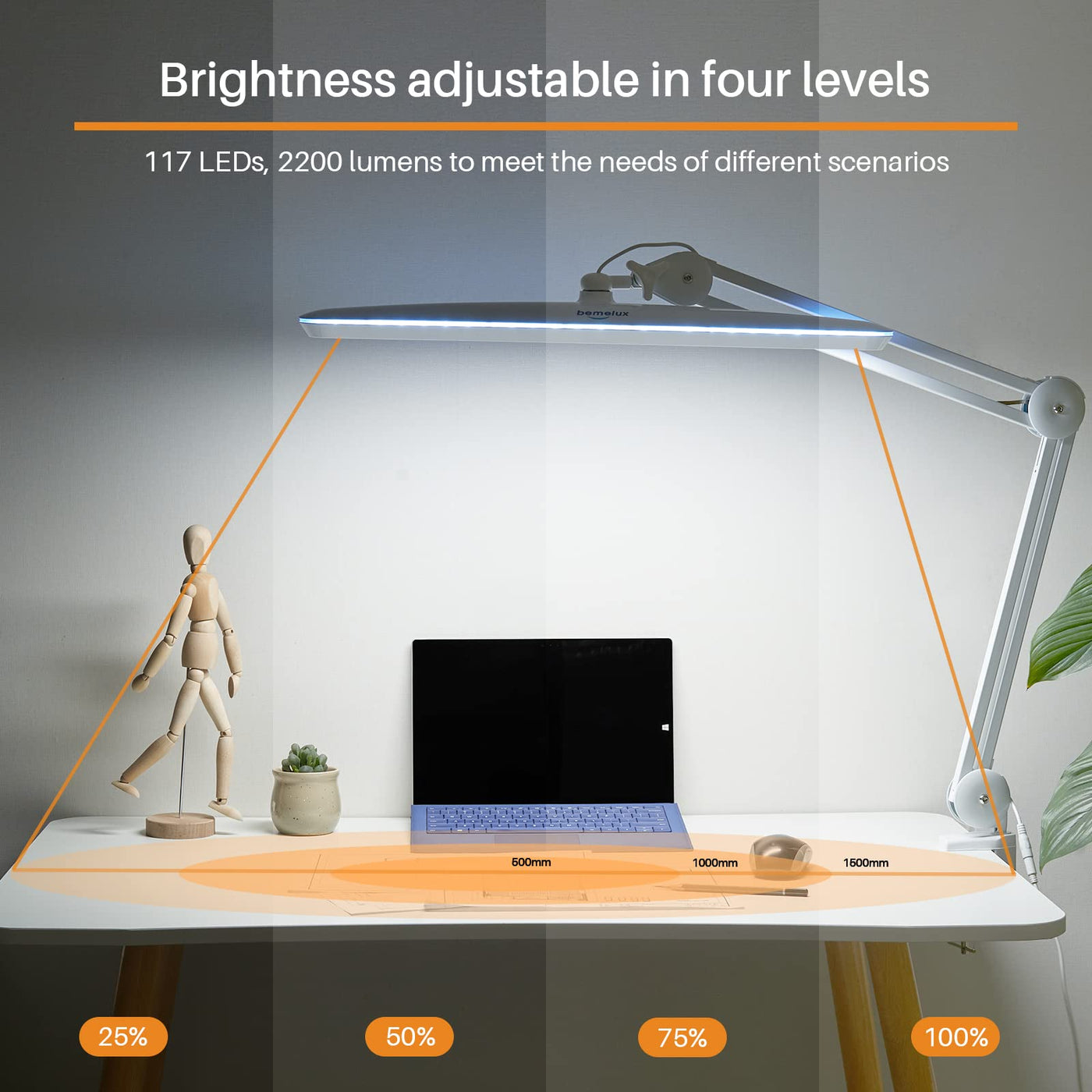 Q: What are the brightness levels available for the Bemelux Task Lamp?A: The Bemelux Task Lamp features 4 brightness levels: 100%, 75%, 50%, and 25%, allowing you to adjust the light according to your needs. This versatility is perfect for various tasks, whether you are reading, crafting, or working on detailed projects.
