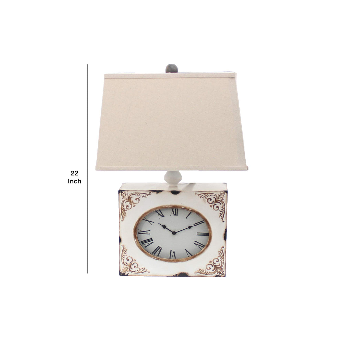 Benjara Bm217251 Clock Design Metal Table Lamp With Tapered Shade White & Beige - 22 X 7 X 4.75 In.
