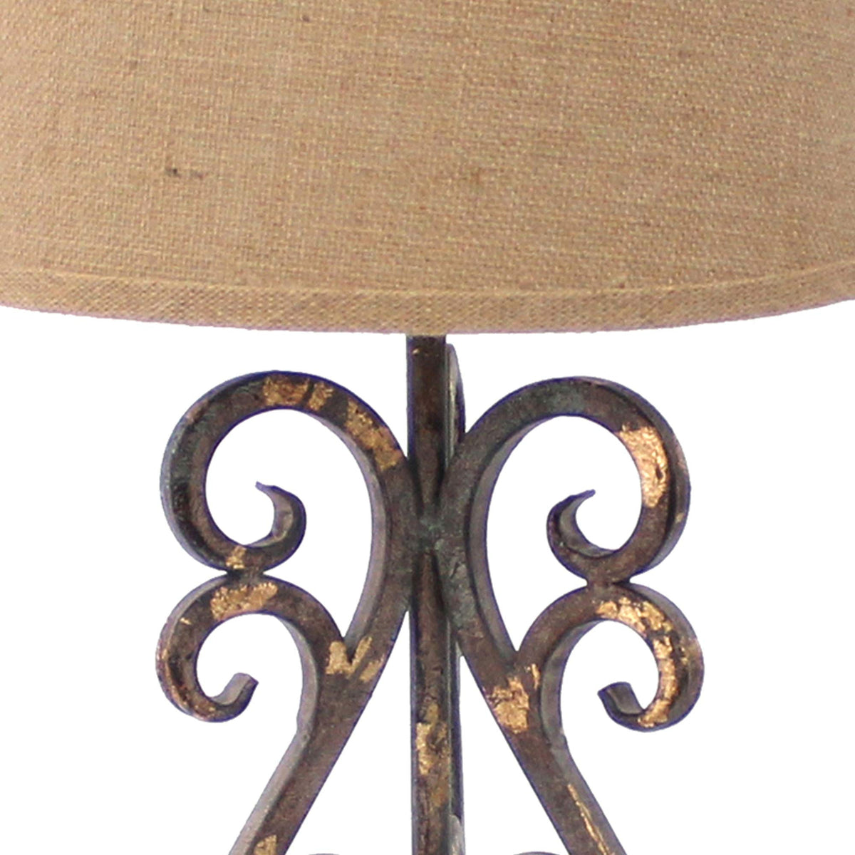 Compliment your home with this antique looking table lamp featuring sturdy metal construction. The scroll design frame is accented with distressed bronze finish which enhances the look. The tapered drum shade completes the look. It has 2 way switch and requires 150 watt bulb to function properly.