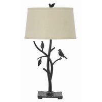 Add a natural and environmental feel to your home by bringing in this beautiful table lamp. It features and iron body in a black finish, showcasing tree and bird design that enhances it look. It is incorporated with a fabric tapered shade and a 3 way switch for optimal intensity control.