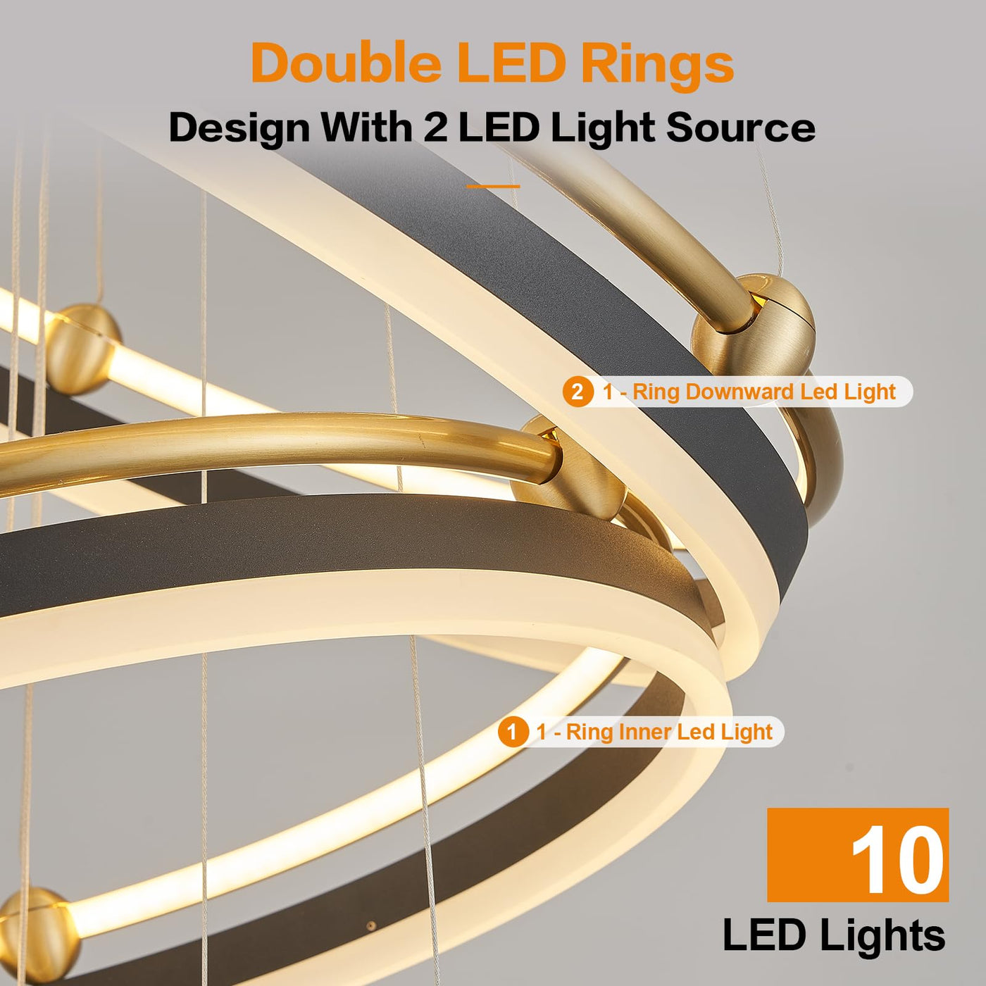 Benkut 5-Rings Modern LED Chandelier Black Gold Dimmable Large High Ceiling Chandeliers Remote Chandelier Lighting for Foyer Entryway Dining Room Living Room Staircase(10-Ring Lighting, D29.5'')