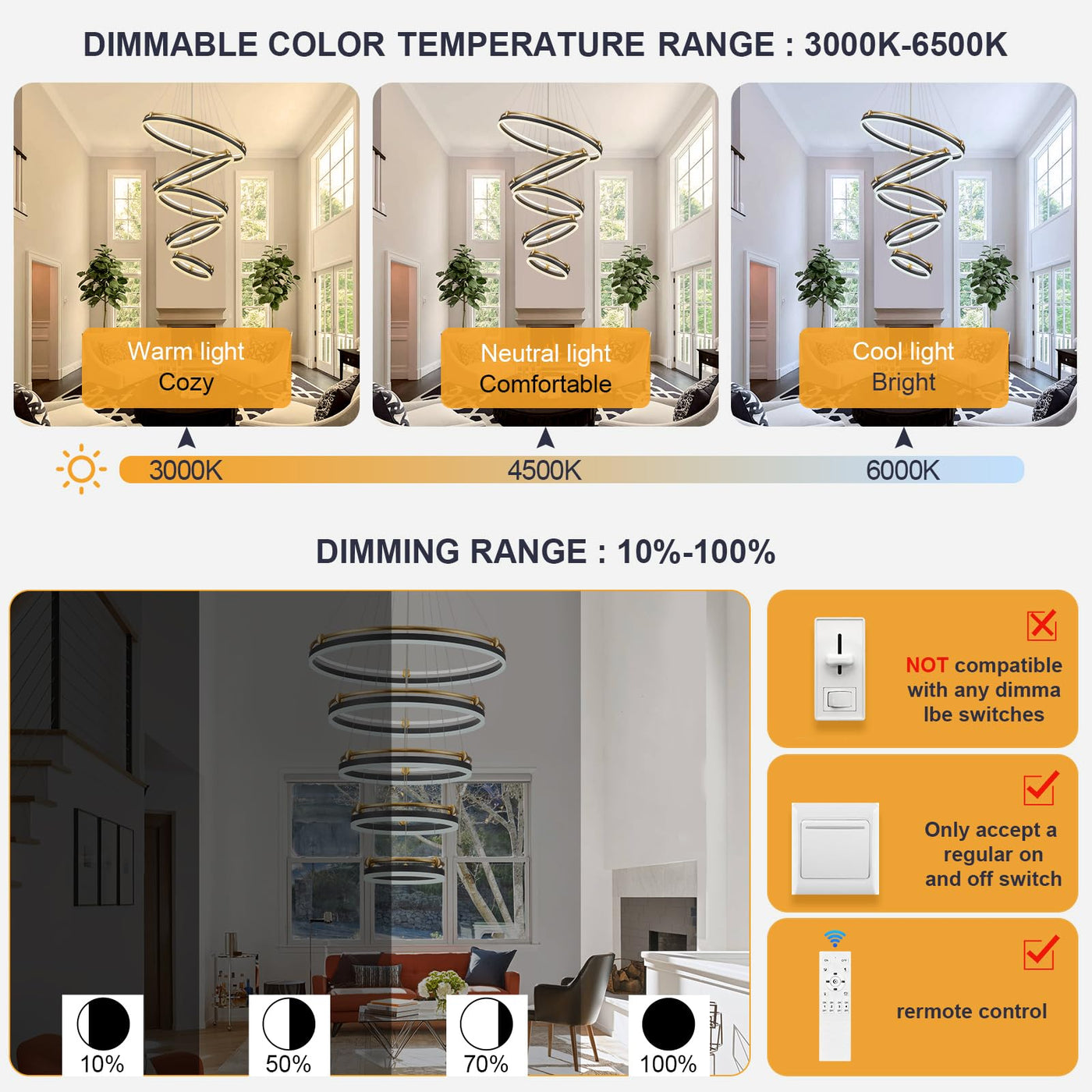 Benkut 5-Rings Modern Led Chandelier Black Gold Dimmable Large High Ceiling Chandeliers Foyer, Remote Pendant Lighting For Foyer