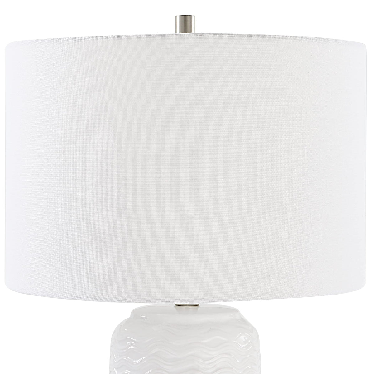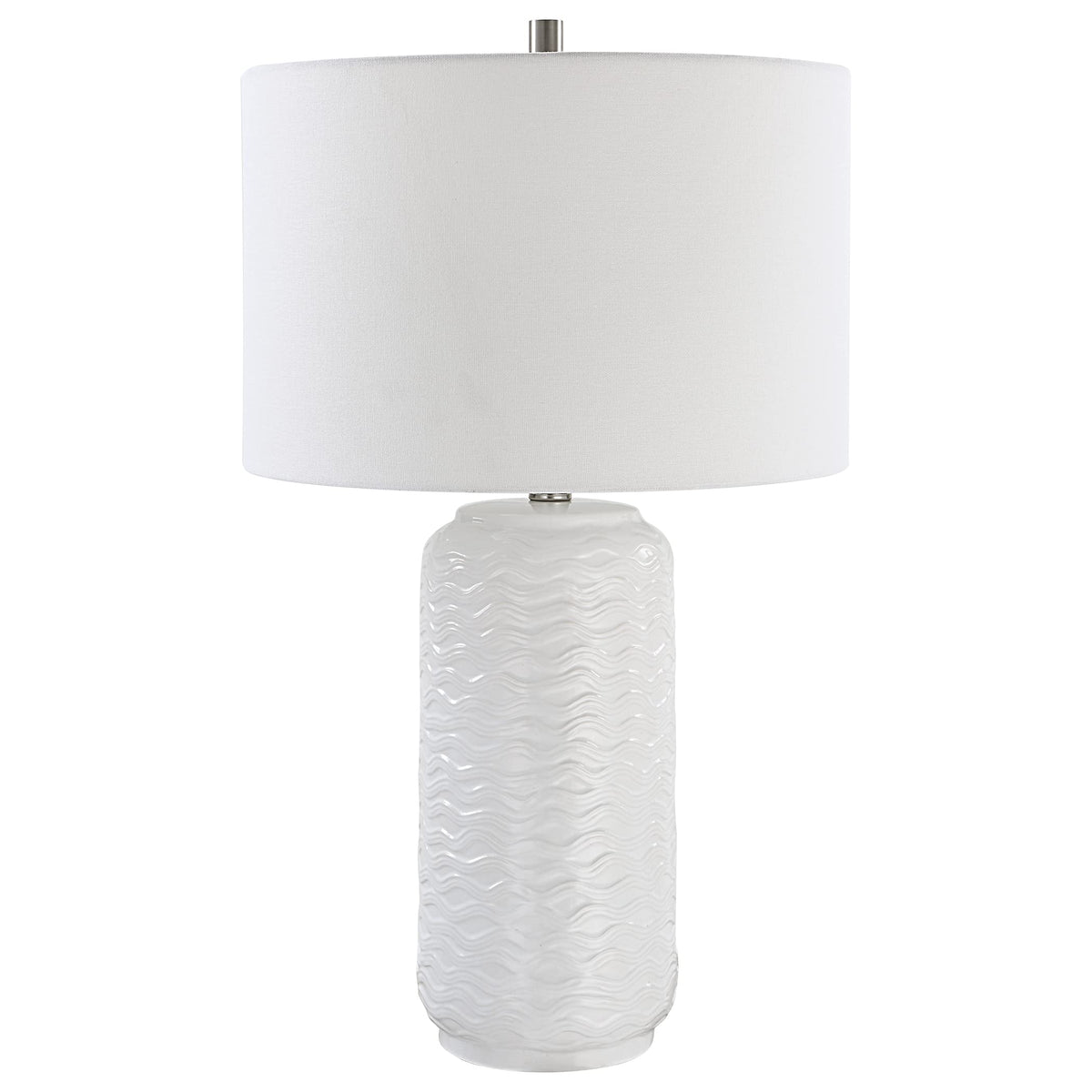 Add a touch of elegance and warmth to your interior spaces with this contemporary ceramic table lamp. Its stunning all-white design, combined with a unique wavy textured finish and brushed nickel accents, makes it a stylish addition to any living room, bedroom, or guest room. The round white linen fabric hardback shade beautifully diffuses light, creating a cozy atmosphere for relaxation or entertaining guests.
