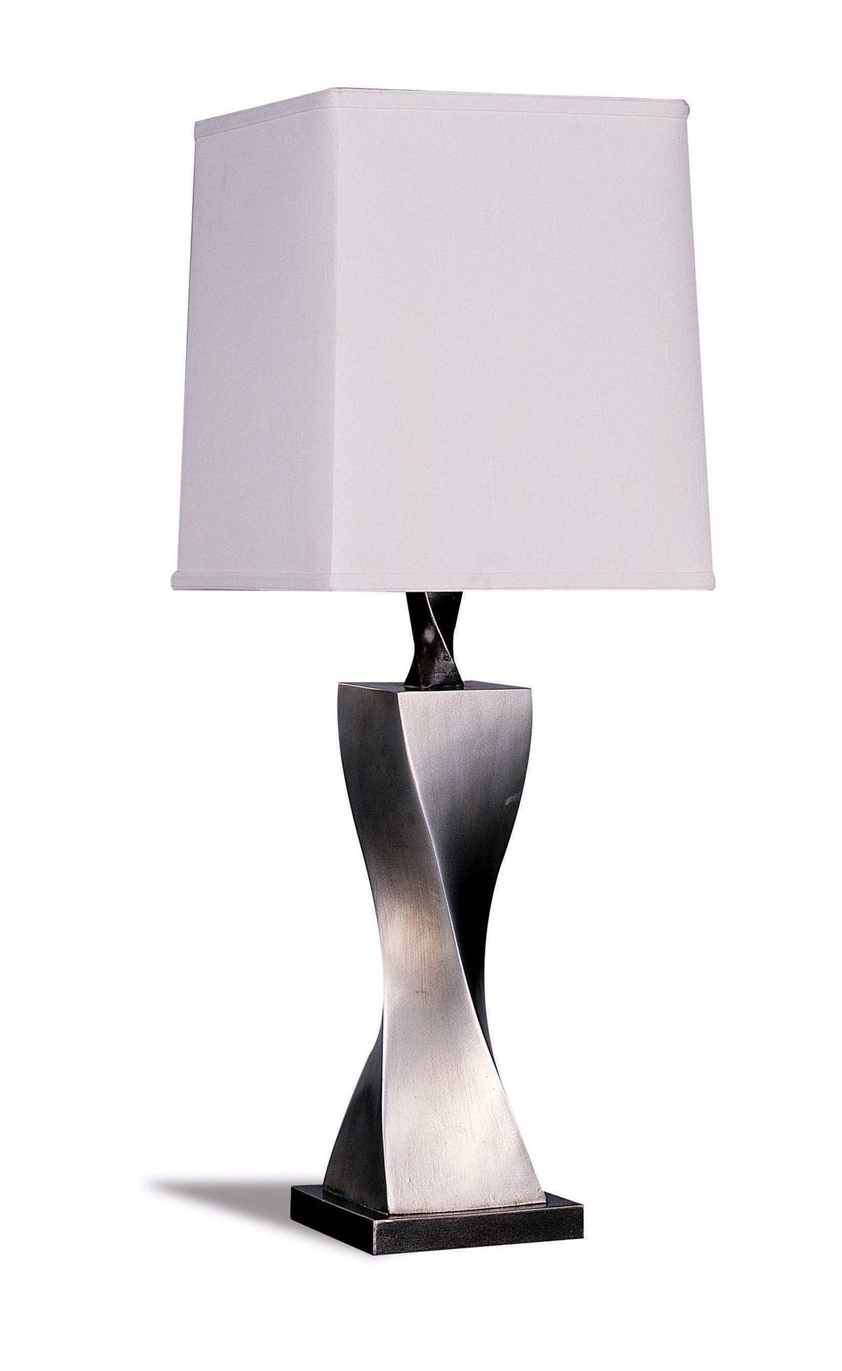Searching for a light source that will simultaneously add style to your space? look no further than this square shade twist table lamp. A gleaming glow with just a glint of glamour, this chic table lamp steals the show no matter where it's shining. Try it centered atop a clean-lined nightstand to make your bedside brilliant, then continue the contemporary appeal around the master suite with a sleek silver mirror above your dresser. Taking on a twisting silhouette, its base is crafted of polyresin and features a metallic finish while the light bulb on top is highlighted by a tapered square fabric shade.