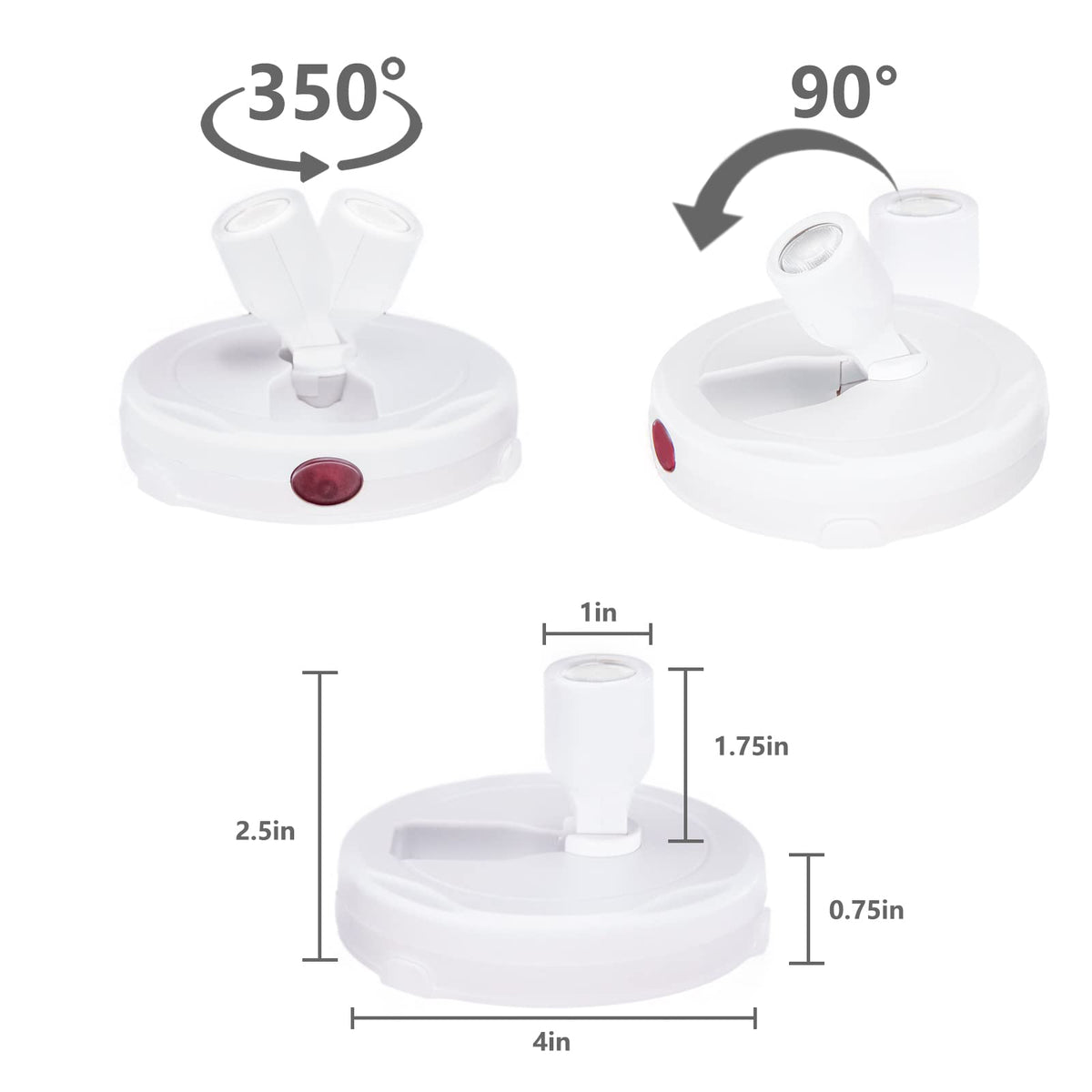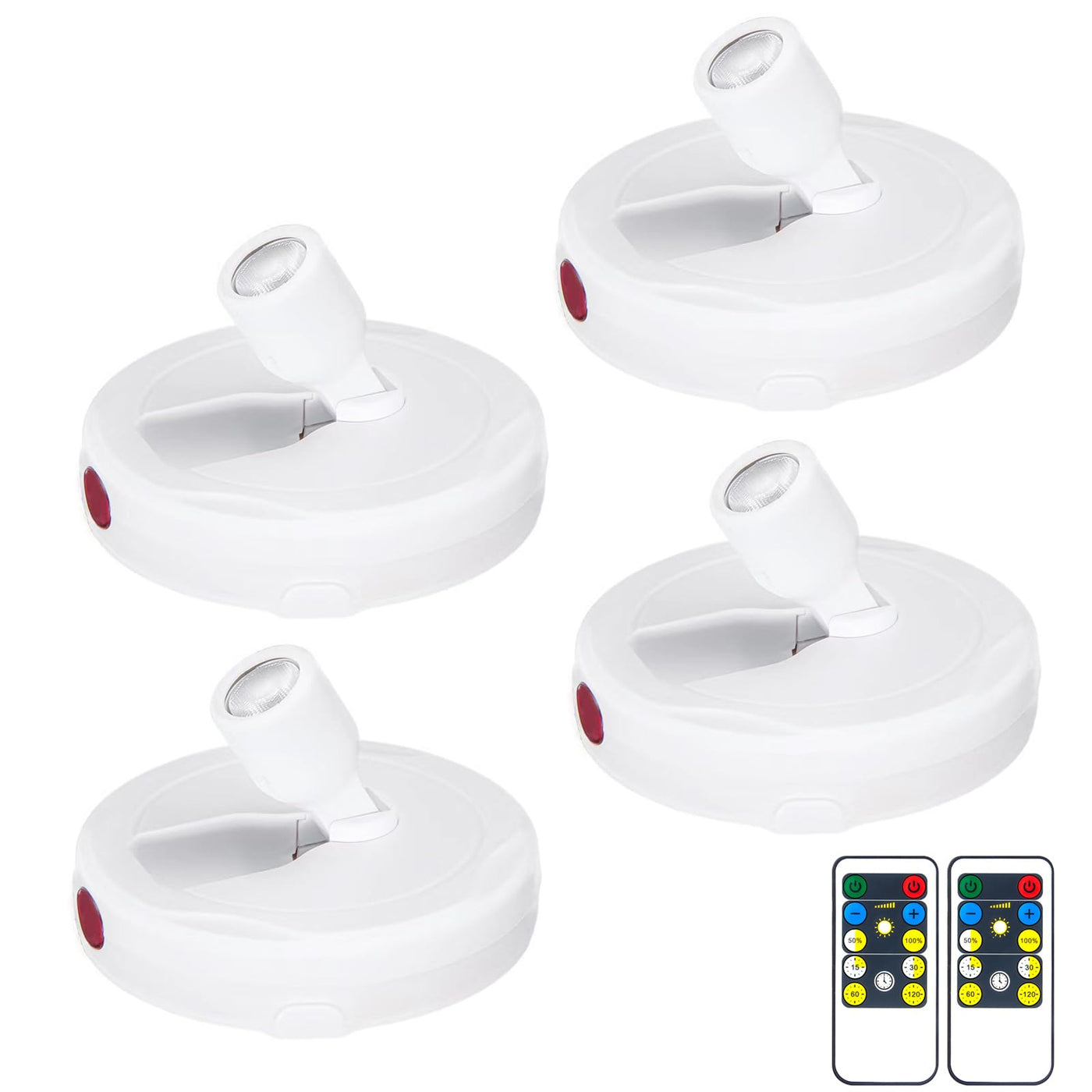 Lumens: 80Lm Wattage: 0.6W Powered: 3 Aa Batteries (Not Included) Run Times: 50 Hours Lifespan: 30000 Hours Color Temperature: 3000K Warm White Light Light Head Rotatable: 350& 90(Height Adjustment) Brightness Level: 50% -100% Timing: 15, 30, 60, 120 Minutes Packing List - 4 X Led Spotlight - 2 X Remote Control - 4 X Hook And Loop Tape - 8 X Screws - 1 X User Manual