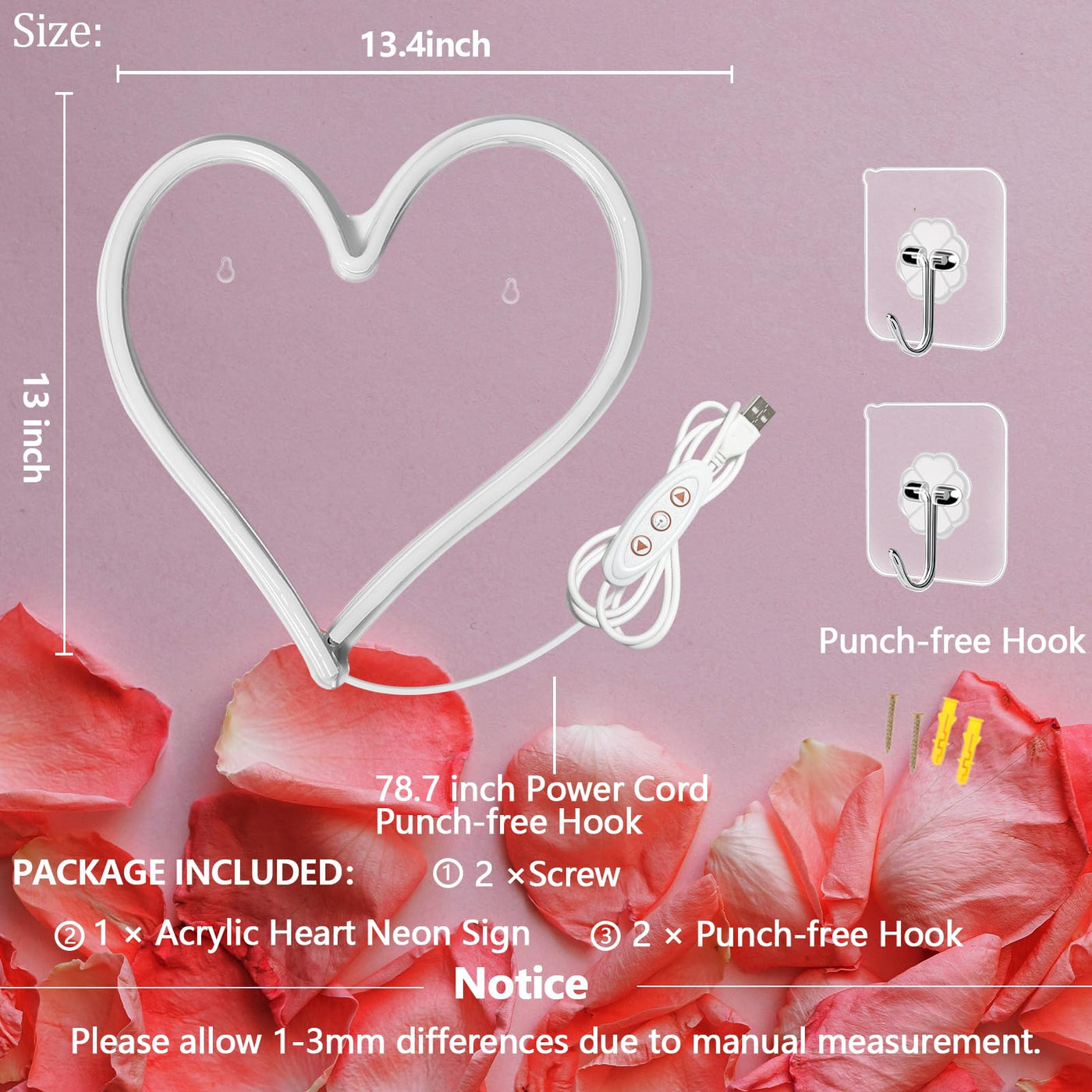 Q: What is the size of the Pink Heart Neon Sign?A: The Pink Heart Neon Sign measures 13.4 inches in length and 13 inches in width, making it a perfect fit for various wall decor arrangements.