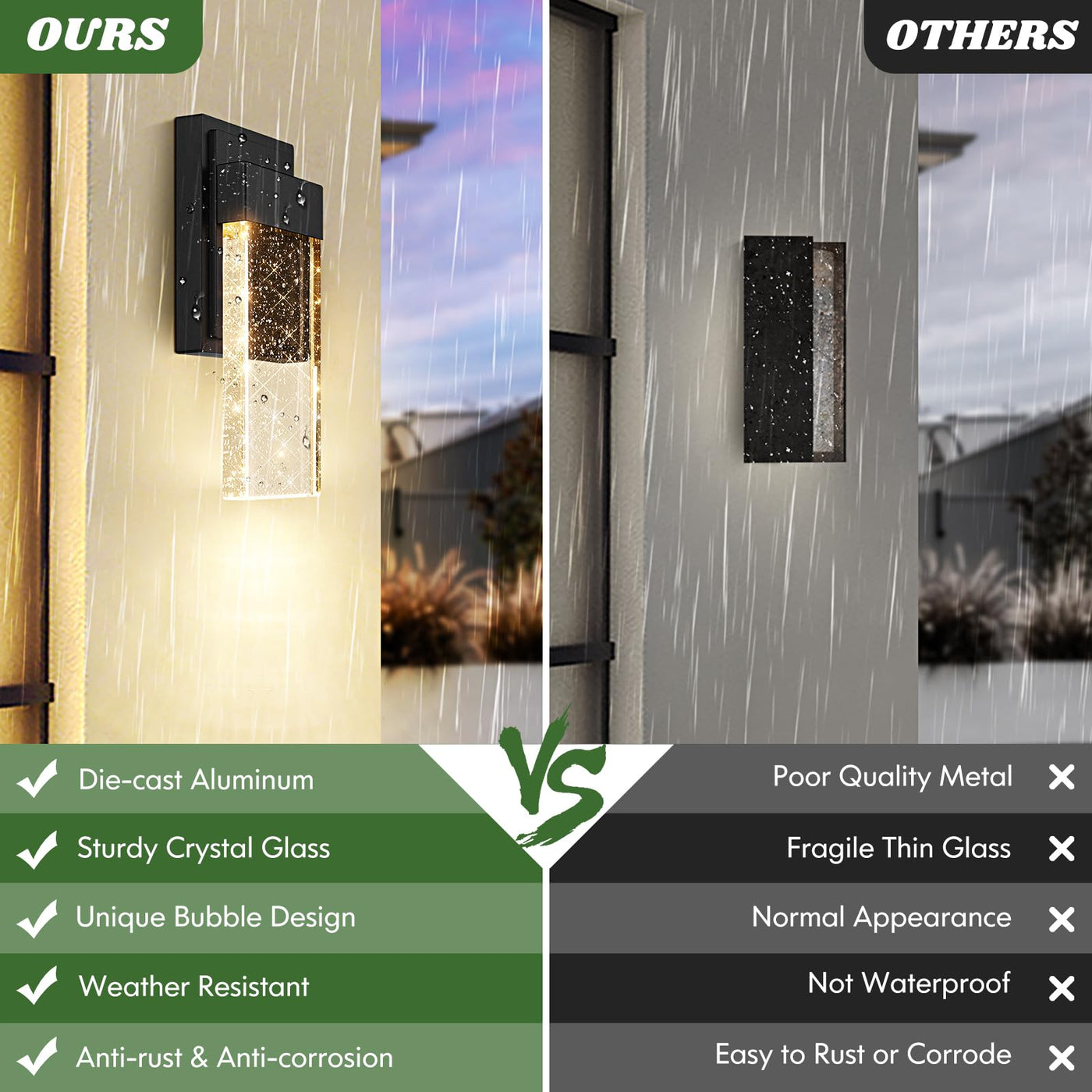 Q: Are these outdoor wall lights weather-resistant?A: Yes, the BesLowe outdoor wall lights are crafted from premium aluminum and robust crystal glass, ensuring they are resistant to rust and corrosion. Their fully sealed design allows them to withstand diverse weather conditions, including rain, snow, and extreme temperatures.