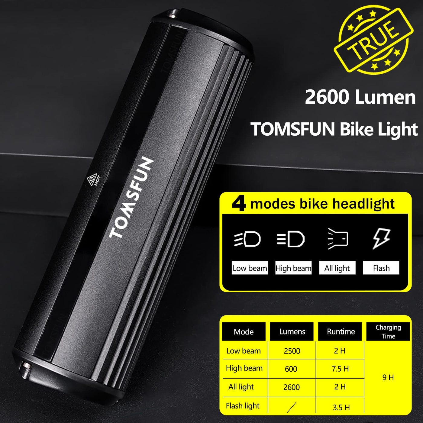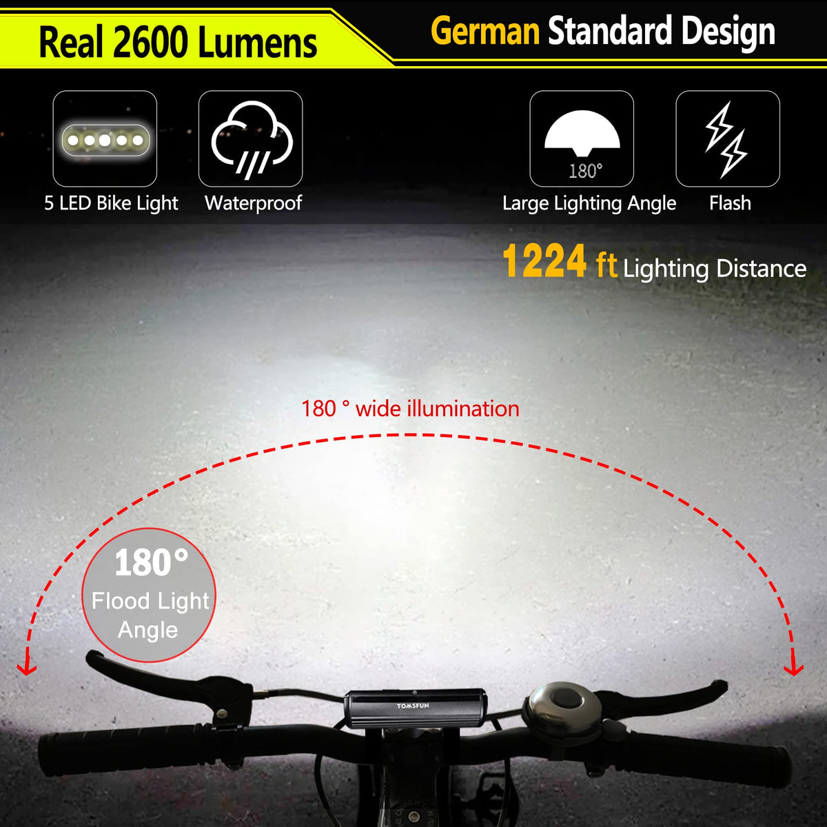 Q: How bright are the Best Bike Lights 2600 Lumen?A: The Best Bike Lights feature a powerful output of 2600 lumens, ensuring excellent visibility during night riding. With 5 LED headlights and 4 different modes, they provide ample light for safer cycling in dark conditions.