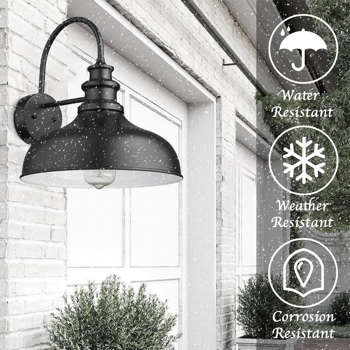 Q: Is the fixture weather-resistant?A: Yes, this farmhouse wall light is made from high-quality materials designed to withstand outdoor conditions, including direct sunlight, rain, and snow, ensuring its durability and longevity.