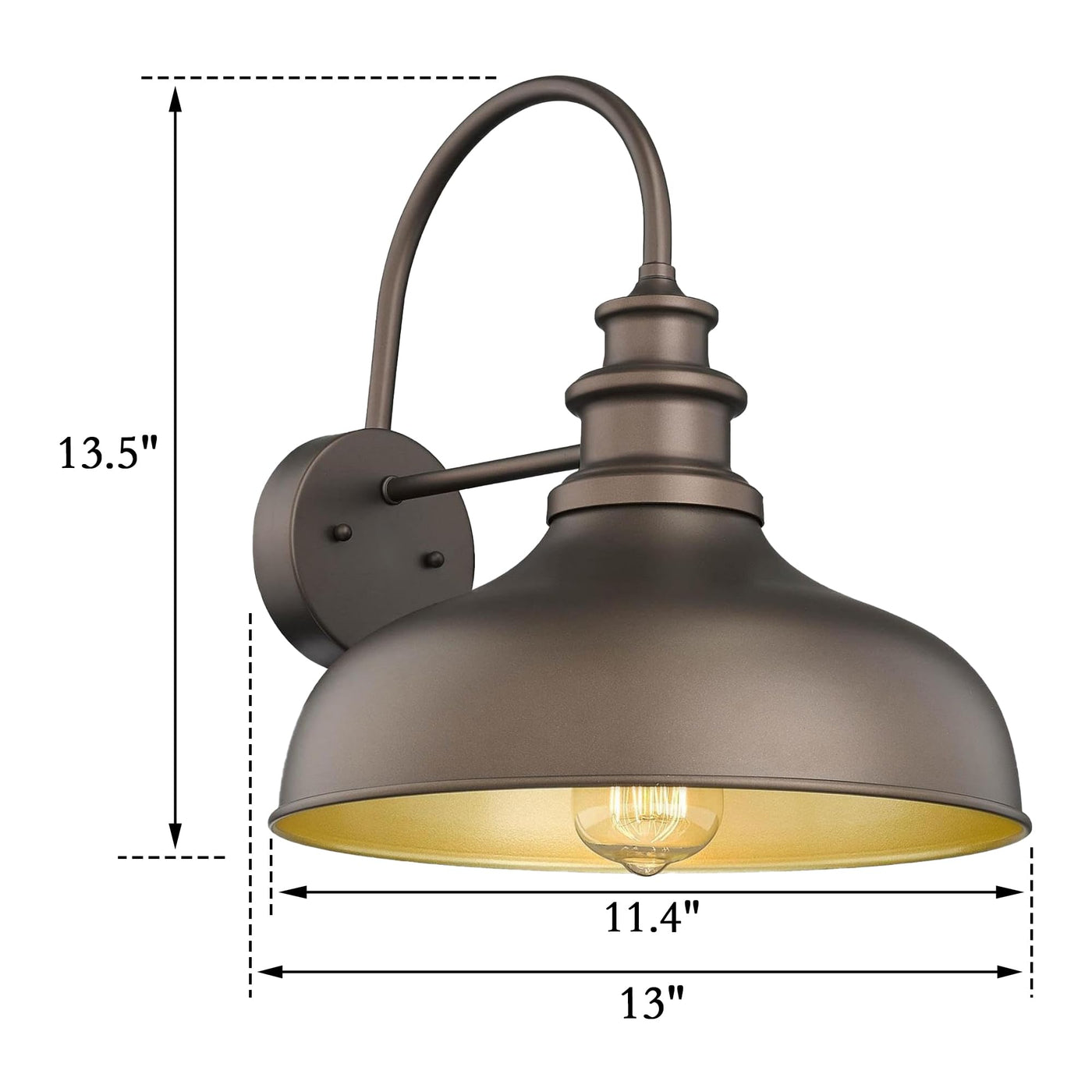 Q: What are the dimensions of the Bestshared Outdoor Gooseneck Barn Light?A: The Bestshared Outdoor Gooseneck Barn Light has dimensions of 11.4 inches in length and 13.5 inches in height, with a width of 13 inches that extends from the wall.