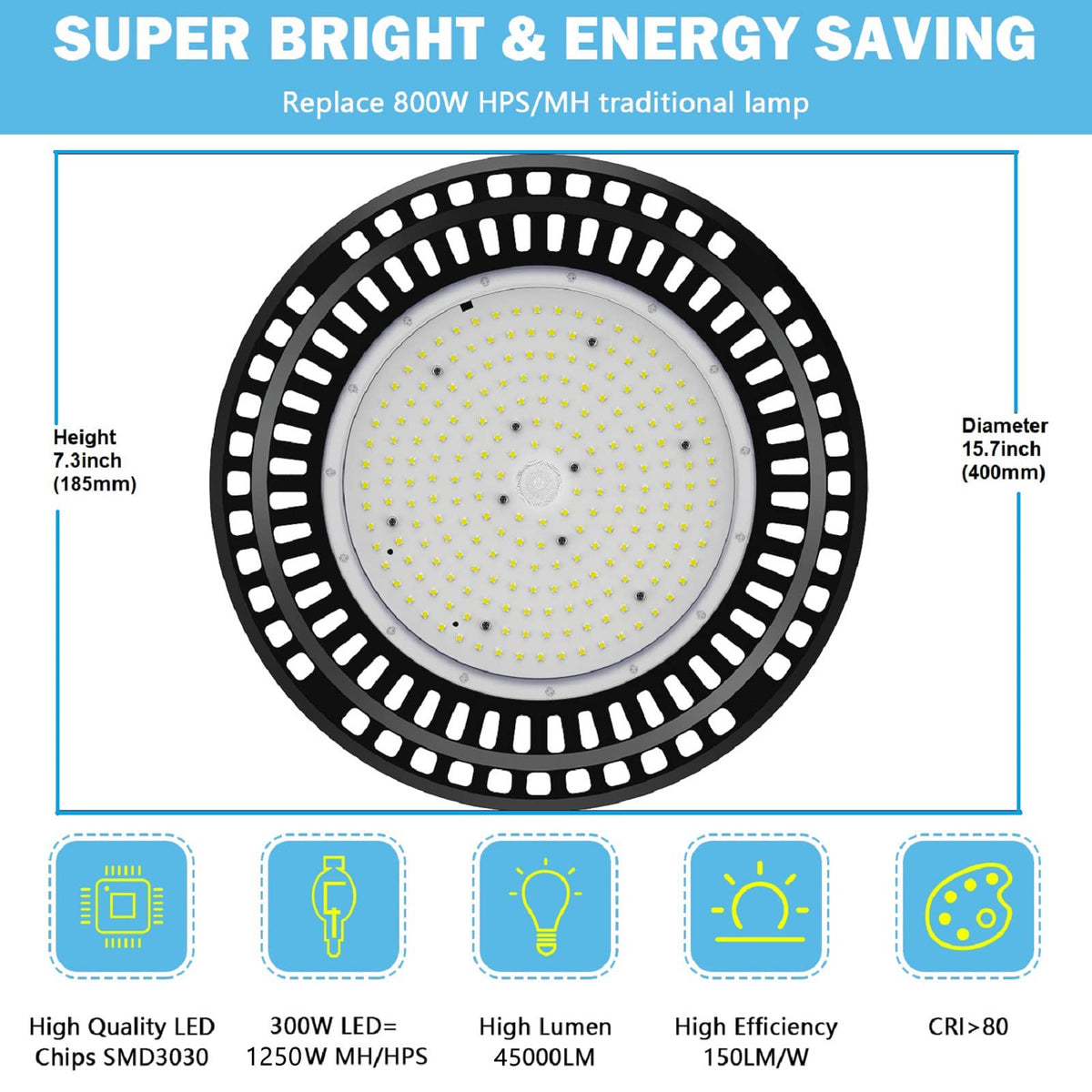 Q: What is the lumen output of the BEULT 300W UFO LED High Bay Light?A: The BEULT 300W UFO LED High Bay Light offers an impressive lumen output of 45,000 lumens, making it equivalent to a 1250W MH/HPS light. This high brightness is ideal for large spaces such as warehouses and factories.