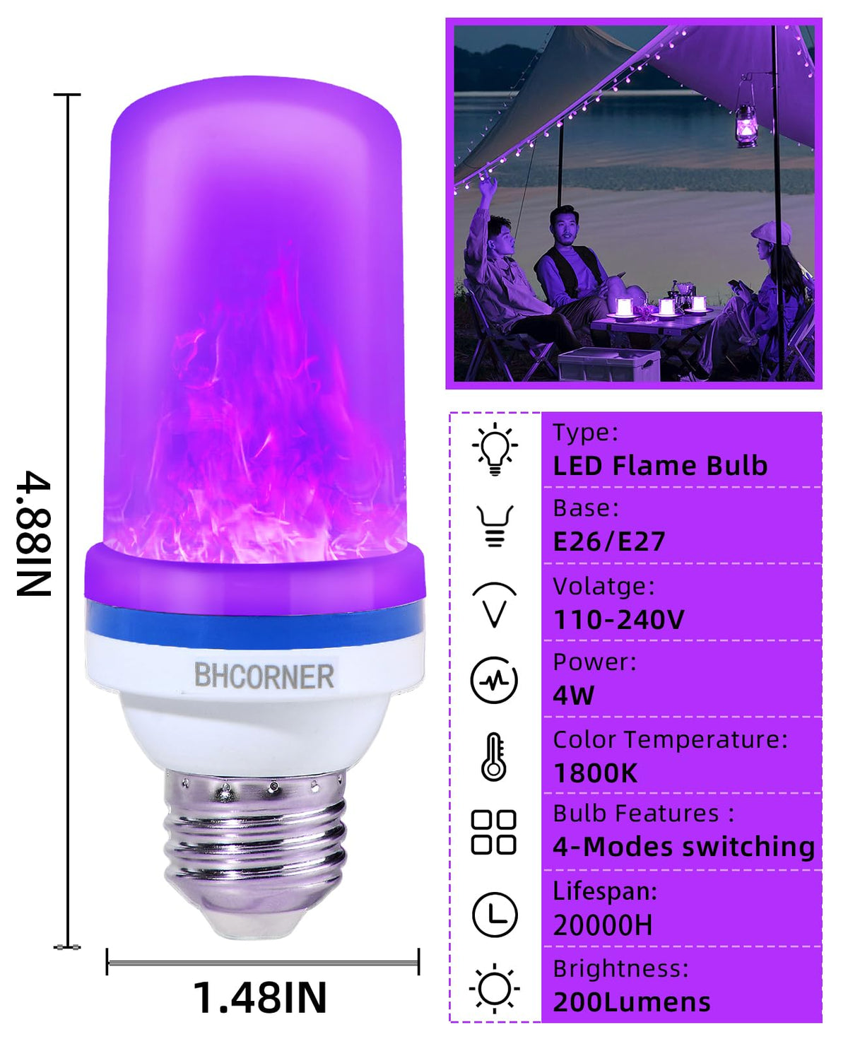 Q: Can these LED flame light bulbs be used for outdoor decorations?A: Yes, the BHCORNER LED Purple Flame Light Bulbs are designed for outdoor use, making them a great choice for Halloween, Christmas, and other festive outdoor decorations, providing a unique flickering flame effect.