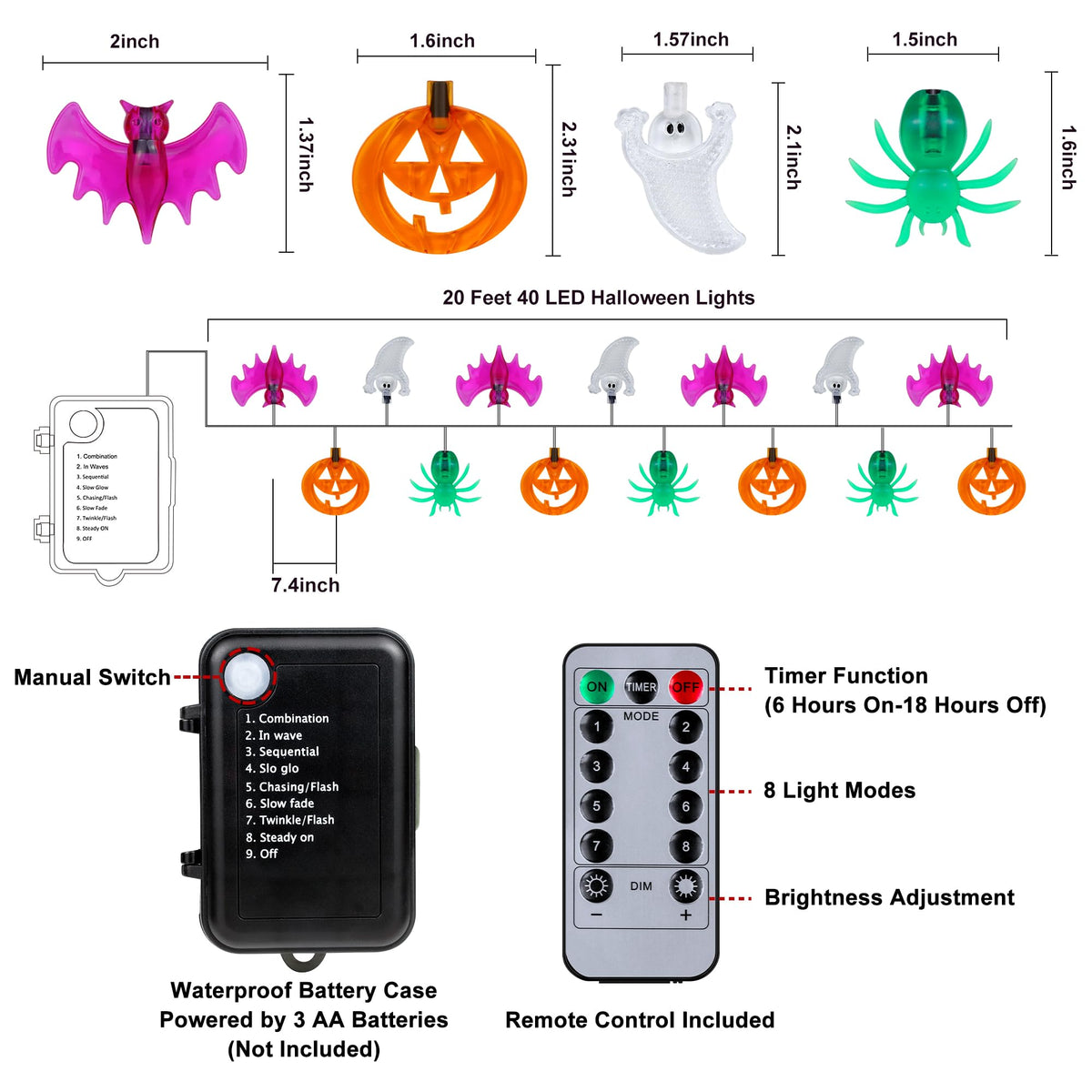 Q: What type of batteries do the Halloween string lights require?A: The Halloween string lights are powered by 3 AA batteries, which are not included. Make sure to have spare batteries on hand to keep your lights shining bright throughout the Halloween season.