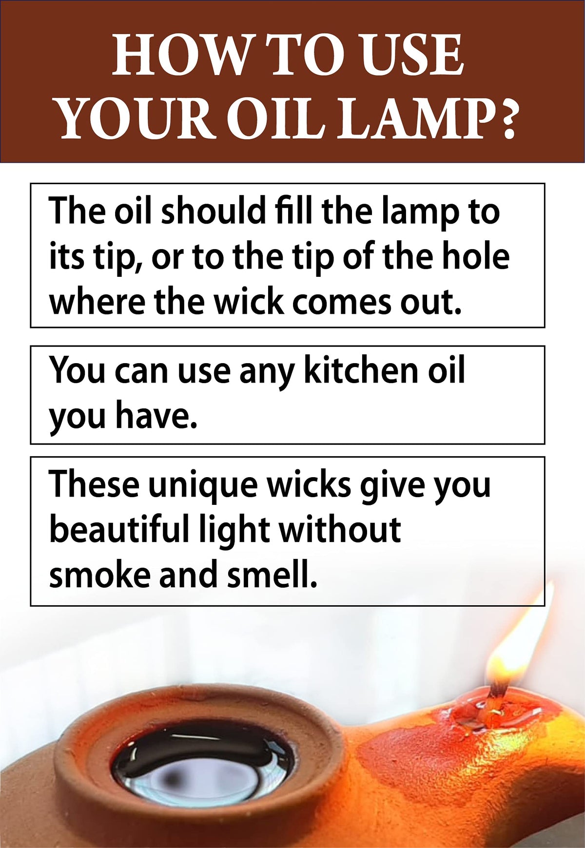 Q: Can I use any type of oil in the lamp?A: Yes, you can use any kitchen oil in the lamp, but olive oil is recommended for the best experience. It provides a clean burn and enhances the lamp's traditional use.
