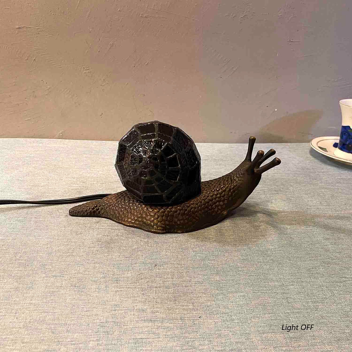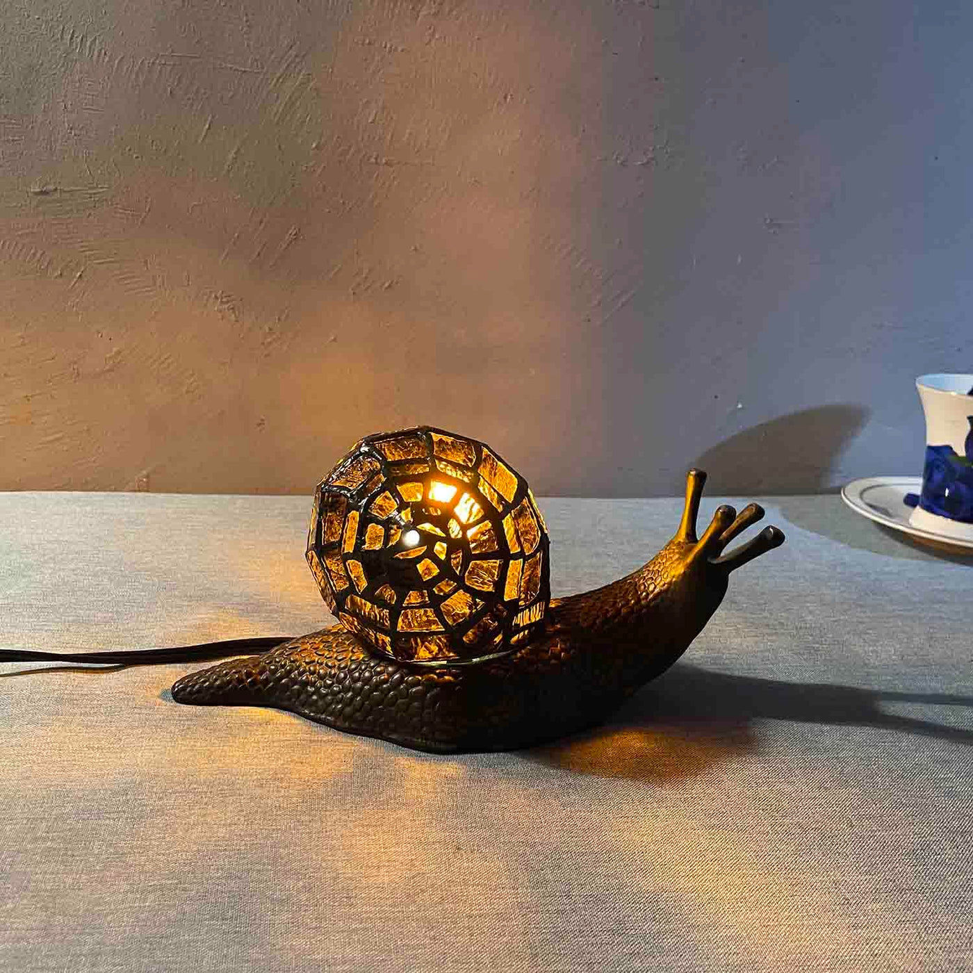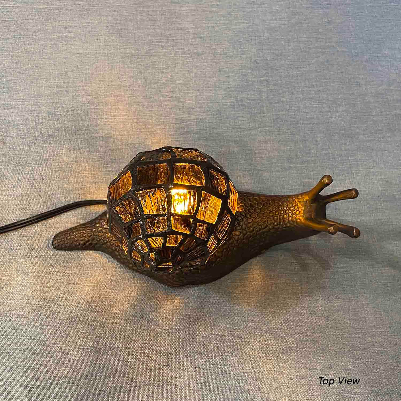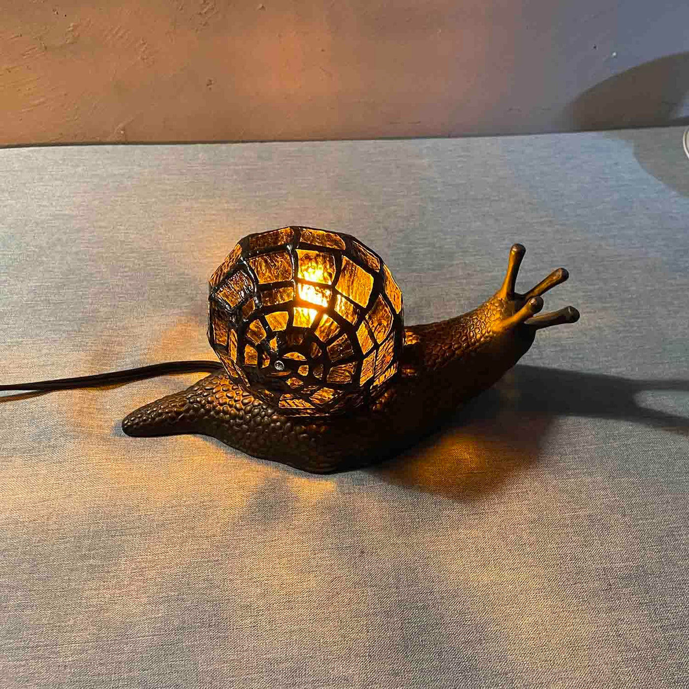 Q: What are the main features of this lamp?A: The lamp boasts a vibrant amber stained glass shell designed to resemble a land snail, an inline switch for easy operation, and is ideal for nature enthusiasts and those seeking distinctive home decor accents.