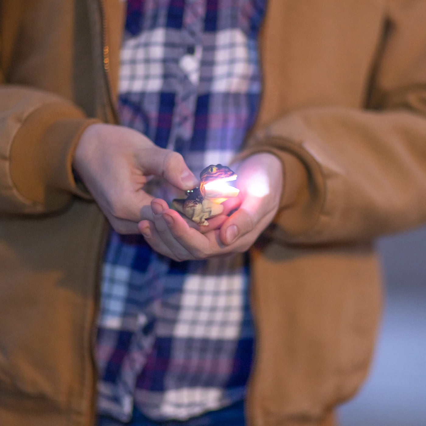 Light up the night with a friend! Push the button on the back of the WildLight to open the mouth, and watch a super-bright white light emerge. Each WildLight is hand-painted and rubber-coated, ensuring long lasting color and functionality. Attached aluminum carabiner clip is perfecting for attaching WildLight to your backpack or keychain. An essential and convenient light while camping or looking through your purse or bag. Also makes the perfect pediatric penlight when attached to your badge or stethoscope. Batteries are included and replaceable. Eight fun and colorful styles available. Ages 6 and up.