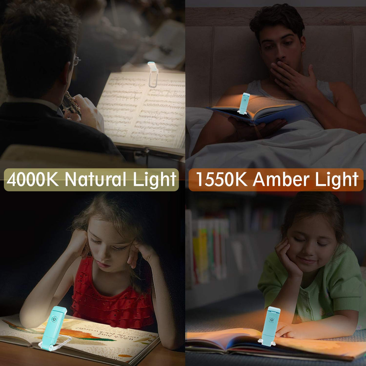 MORE DETAILS * --25 Lumens, one super bright LED, 4000K white daylight, 1550K amber light, 0.15W, 3.7V, 200mA, lifespan is 30000 hours. *-- Lamp Body ON/OFF Touch switch, also with brightness dimmer. *--The power light is blue when charging, once the charging is completed, the blue light is off, then you can remove the light to use. Fully charged takes 1.5 hours and battery runtime is 8 hours. *--The book light is very small and portable, great gift for book lovers, suitable for reading in bed or trips. Packing List - 1 x LED Clip reading light - 1 x User Manual