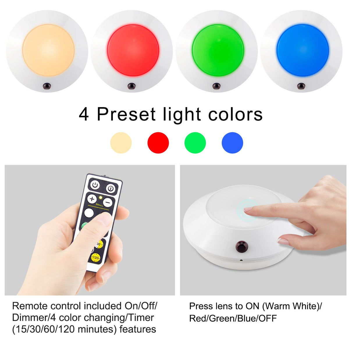 More Details * 170 Lumens, 3000K, 2W, Dc 4.5V, Lifespan Is 30,000 Hours. * The Remote Control Can Operate The Rgb Led Light Within 20 Feet. * Powered By 3Pcs C-Cell Batteries (Not Included), And Each Set Of Batteriesrun Time Is About 100 Hours. * Press And Hold The Tap Lens Or By Pressing The Button On Remote To Select Brightness As You Wish. * Choose A Color From The 4 Colors By Pressing A Corresponding Color Button. *Set Timer To Turn Off In 15, 30, 60, 120 Minutes By Remote Control. * Easy To Install With Screws(Included). * Can Be Used Anywhere Like Elder'S Room, Kid'S Room, Bathroom, Hallway, Wedding, Party Decoration, Stair Corner, Entrance Door, Etc. Packing List - 1 X Led Ceiling Light - 1 X Remote Control - 2 X Screw - 1 X User Manual