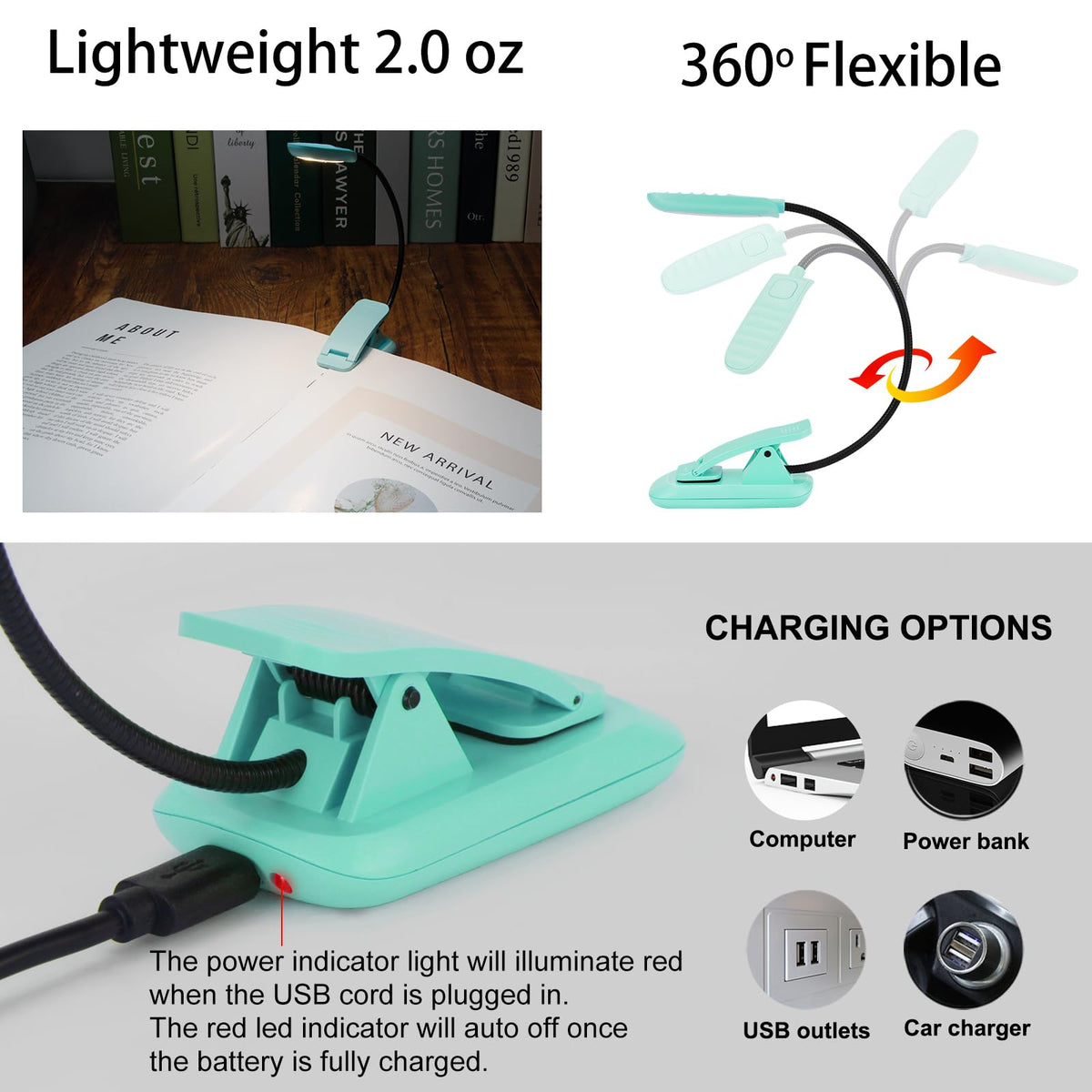 BIGMONAT Rechargeable Book Light, Adjustable Brightness, 2Pack - Blue, Lightweight Clip, 360° Rotary, Plastic Material