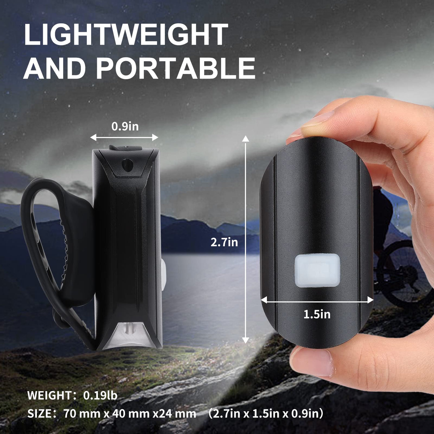 Q: What safety features do the bike lights have?A: The bike lights set includes a useful battery indicator that displays the remaining power. The indicator turns red when charging and switches to green when fully charged. Additionally, the different lighting modes enhance visibility, ensuring safety during nighttime rides.