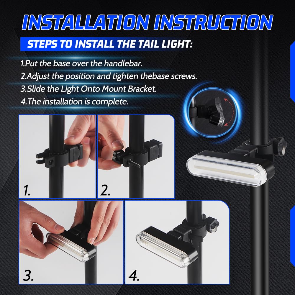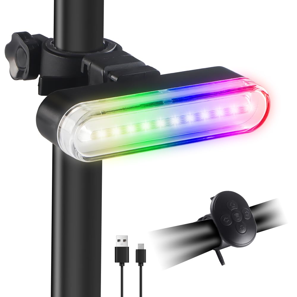 ?Strong Brightness?1200 lumens bike tail light with with RGB Colors, provide a increased visibility and safety for night riding. IPX6 waterproof function allows you to ride with confidence even in rain or snow | ?14 Light Modes+7 Colors Options&Memory Function Tail light ?Our 2025 upgraded wireless remote control bicycle lights have 7 Color 14 Modes-Steady Mode-(bright red, soft red, pink, white);Strobe mode-(red- red + blue); Flowing Mode:(Red light, Mode 1/2/3 color changing);Rainbow Mode-(colorful Rainbow Spot, Flowing single spot); Left and right Turn Signal mode; Long pressing to on and The light mode has a memory function, and it is still the last mode used when you open it again. | ?Easy Installation, Remote Control?You only need a few seconds to install and remove the lights, after installation, whether on steep or bumpy roads, the bicycle turn signals can be firmly fixed on the frame, will not shake or fall. Remote control: Only one remote control can control the mode of RGB Tail Light | ?Wide Compatibility?This bike wireless Bike Light can be installed in the front and rear positions depending on your need. They are suitable for non-motorized vehicles such as bicycles, electric bikes, scooters, etc. Highly recommended bicycle rear lights for office workers, and students. If you have any questions, please feel free to contact us. | ?USB charging and IPX6 Waterproof?The Tail Light feature USB rechargeable,and come with USB Rechargeable cable,It can be used for 6-10 hours(Depending on the modes),You can charge it with a plug, a power bank, a computer, etc