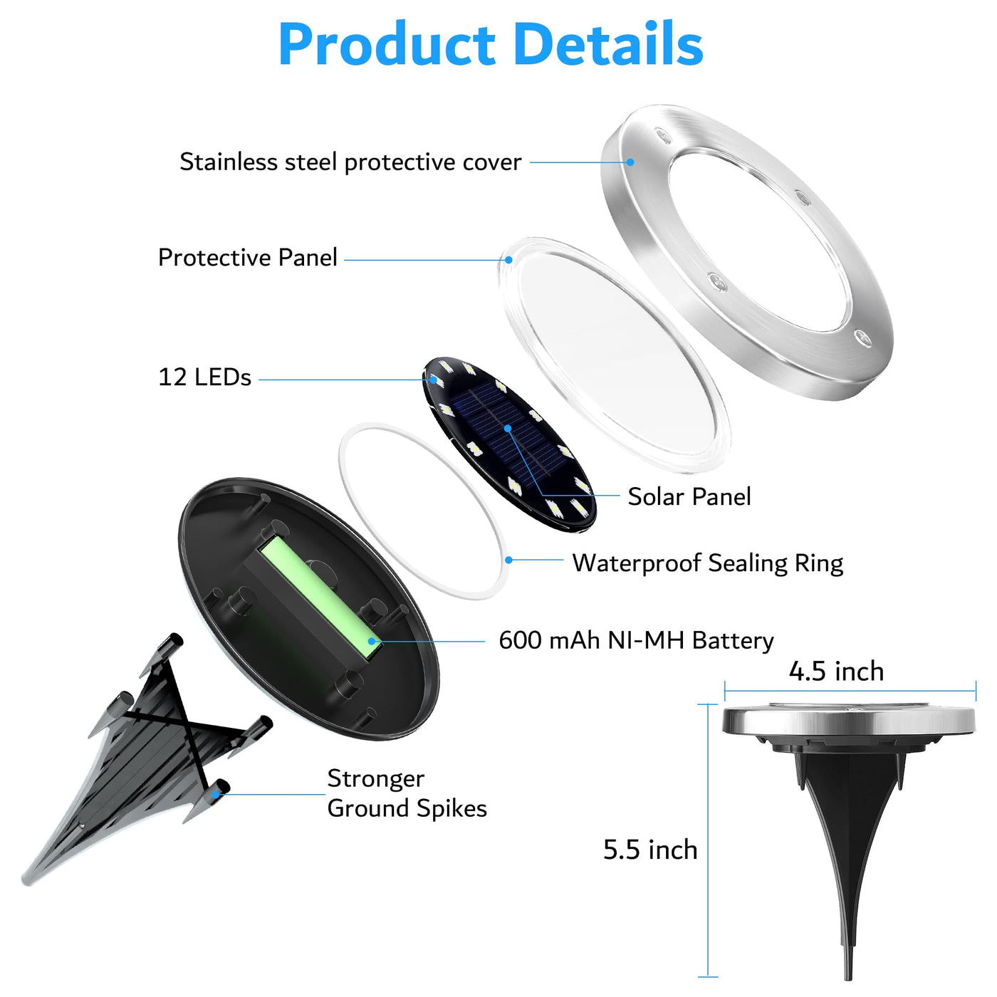 Q: What is the size of each solar ground light?A: Each Biling solar ground light has a diameter of four and a half inches and a height of five and one-tenth inches.