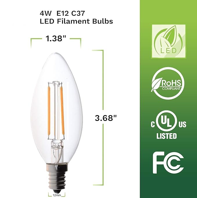 Elevate your home decor with Bioluz LEDs non dimmable filament candelabra LED light bulbs. These smart light bulbs feature a warm and inviting 2700K color temperature. Whether you're illuminating your dining room chandelier light bulbs or adding a touch of warmth to your bedroom with night light bulbs, these LED lightbulbs are your ideal choice.Efficiency Meets Versatility. Available in convenient 6-pack and 12-pack options, Bioluz LED's energy saving light bulbs offer efficiency without compromise. Consuming just 4 watts of power, these e12 candelabra bulb 40 watt equivalents not only reduce energy costs but also deliver a radiant 350 Lumens of light. Say goodbye to frequent bulb changes; our small light bulbs are built for longevity, ensuring a dependable and enduring glow throughout your home, including bathroom light bulbs and LED ceiling light fixtures.Warm & Inviting Illumination for Every Space. Crafted with quality and efficiency in mind, our warm light bulbs blend energy savings with the inviting warmth you seek. These outdoor light bulbs are also perfect for dusk to dawn outdoor lighting, providing consistent illumination. Compatible with any fixture equipped with an on/off switch and an E12 candelabra base socket, these light bulbs offer versatility and convenience for all your lighting needs.Why Choose Bioluz LED? Energy Efficient: Our LED light bulb design ensures you enjoy bright illumination with consumption low. Wide Application: Ideal for chandeliers, ceiling fans, outdoor fixtures, and more, making them perfect for both indoor and outdoor lighting solutions. Long-Lasting: Durable construction means these light bulbs will last. Enhanced Ambiance: The 2700K warm light creates a cozy and comfortable environment. Make the transition to Bioluz LED light bulbs today and transform the ambiance of your home. Choose quality, choose efficiency, choose Bioluz LED.