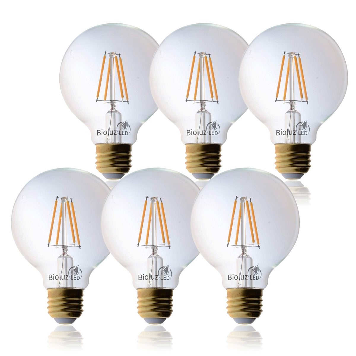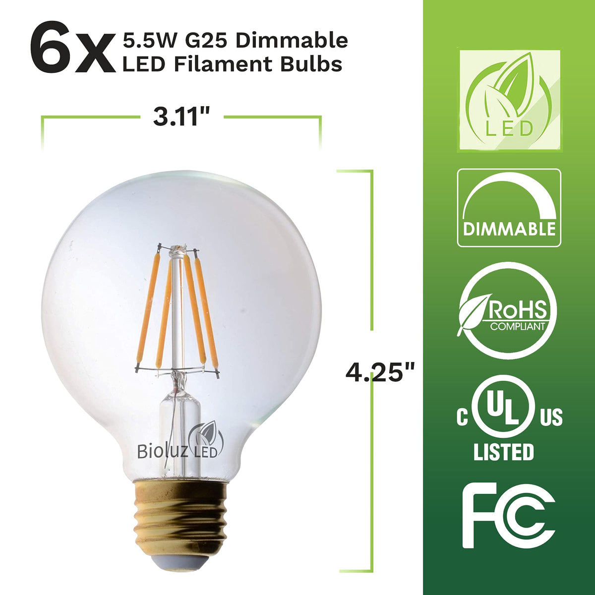 Bioluz LED g25 globe Series Bioluz LED introduces our new DIMMABLE g25 globe series of light bulbs Standard medium base with perfect incandescent appearance - both physically as well as in light quality Now available in two different 40 watt equivalent versions - White (450 lumens using 6 watts) and Filament style (470 lumens using only 45 watts) Bioluz LED offers beautifully styled lamps for your home and office Warm and bright, Bioluz LED high performance lamps offer aesthetically pleasing designs combined with quality and energy efficiency Add Bioluz LED energy efficient LEDs to your home or office while maintaining the cosmetic beauty, brightness and color youve come to love What are Lumens and Kelvins Lumens are a measurement of how much light is generated - or brightness - each lumen emits approximately the same amount of light as one candle Kelvin represents the color (which is based on the temperature) of the light Bioluz LEDs are manufactured so that our 2700 Kelvin bulbs are nearly identical in color to incandescent bulbs Our 3000K bulbs are designed to match halogen bulbs Weve found that bulbs which are 4-5000K generates a bluish tint on objects (like at a hospital or office building) and are not as comforting in a home Many brands sell and market higher Kelvin (4-5000) bulbs with lower lumens to make them appear brighter Bioluz LED manufactures the correct color bulbs with exceptionally bright, energy efficient LEDs, so you get the color and brightness youre accustomed to without the harsh effect of higher color temperatures