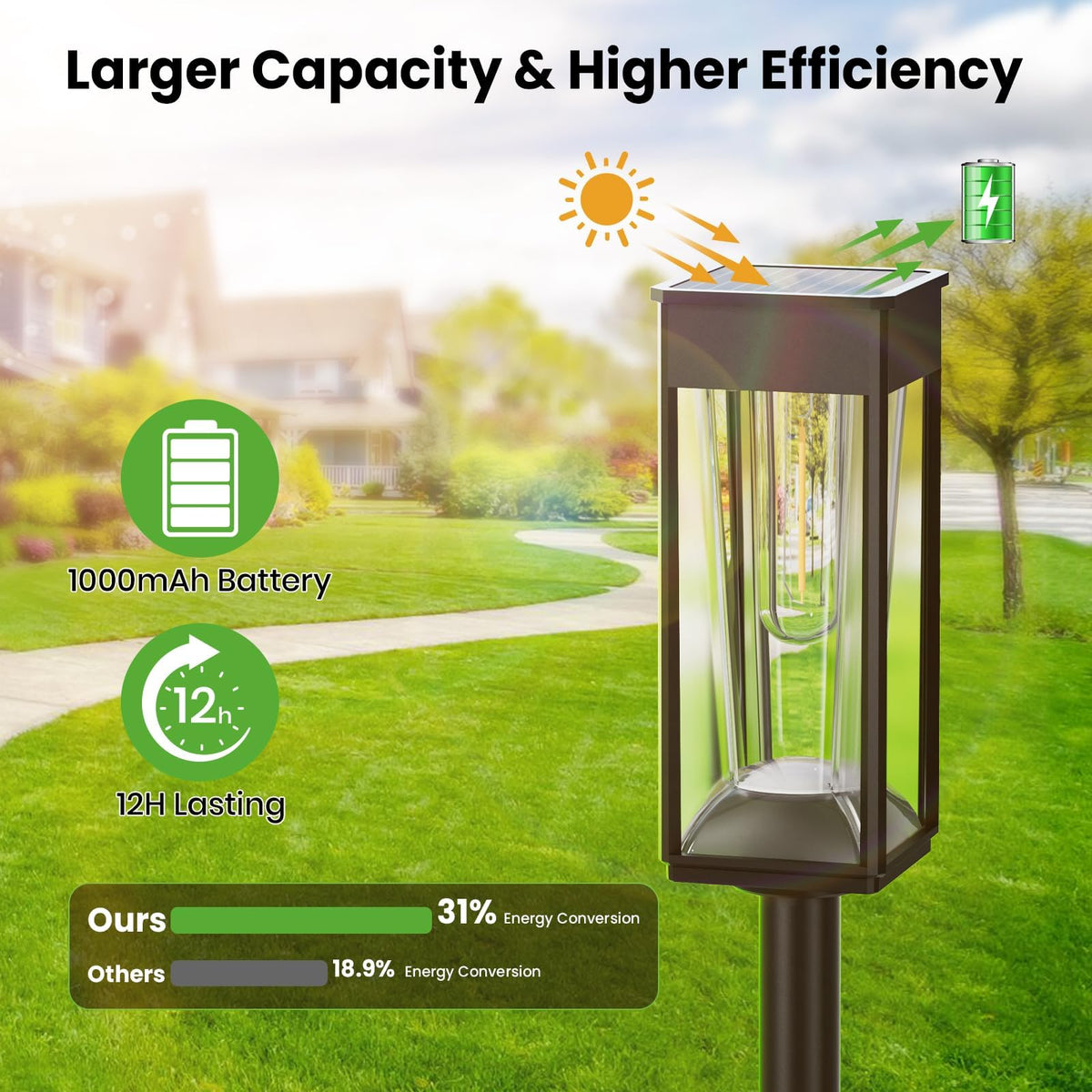Q: What is the energy conversion efficiency of these solar pathway lights?A: These outdoor solar pathway lights boast a 30% energy conversion rate, thanks to the upgraded 5V/80mA solar panel that effectively absorbs sunlight even on overcast days.