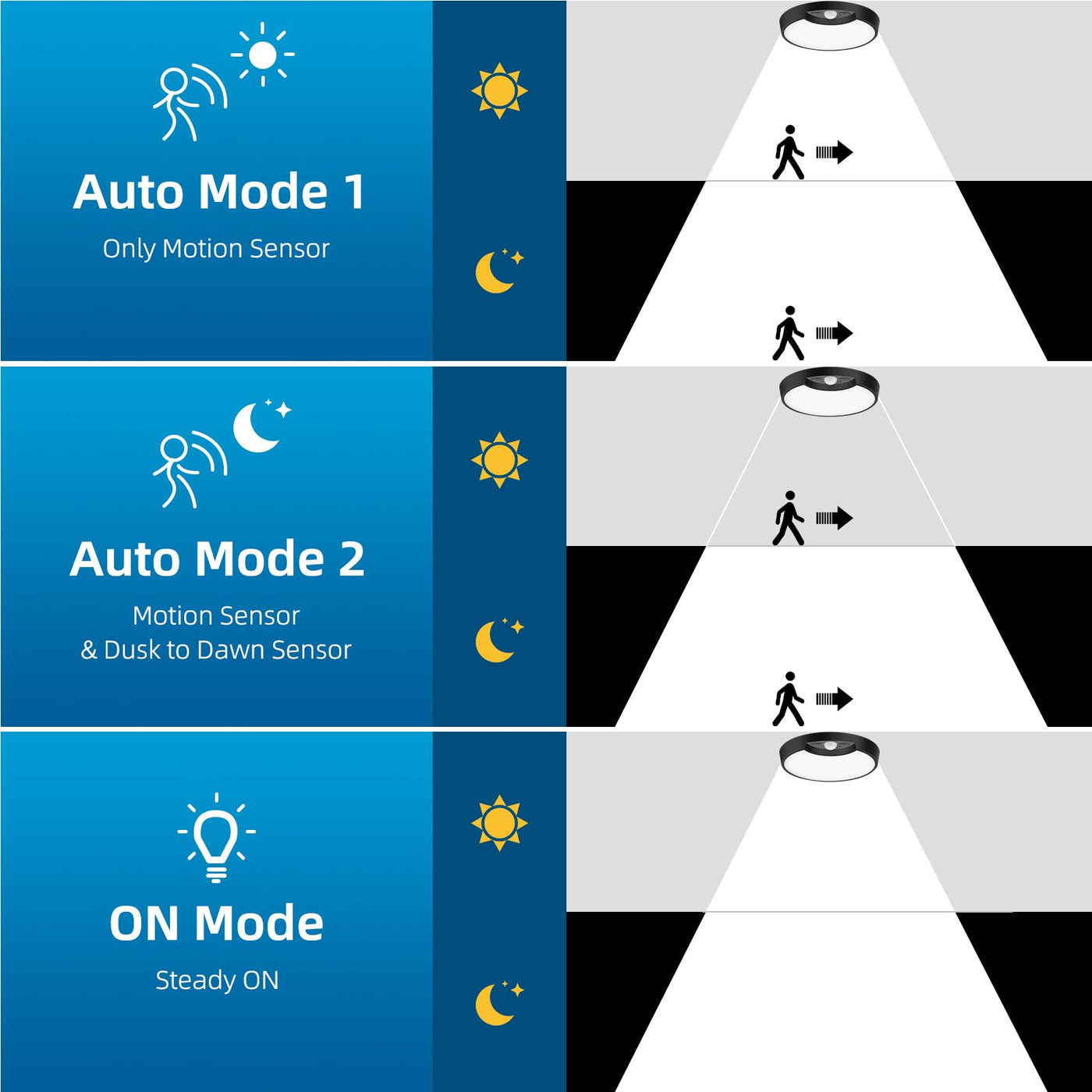 Q: How do the different modes of operation work for this ceiling light?A: The light features three modes: Auto Mode 1 activates the light during the day when motion is detected, Auto Mode 2 activates it at night, and Manual Mode allows you to turn the light on and off as needed, providing versatility for different situations.