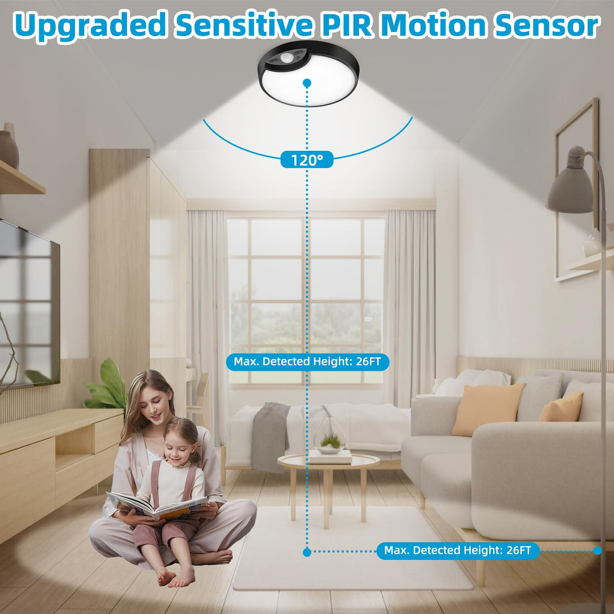 Q: How does the PIR motion sensor work on the Black Battery Operated Motion Sensor Ceiling Lights?A: The PIR motion sensor detects movement within a range of 26 feet and a 120° field of view. When you enter its detection area, the light automatically turns on, providing illumination as you move, which is ideal for dark spaces like closets or bathrooms.