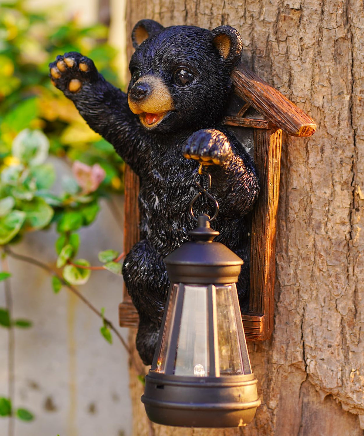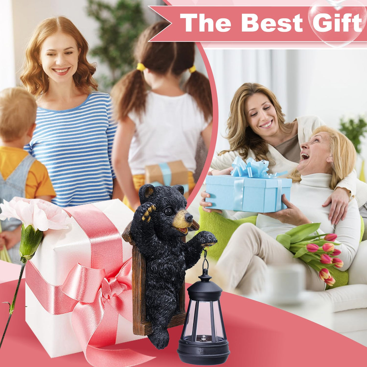 Black Bear Decor With Solar Lantern Tree Hugger - 8 Inch Bear Statue Outdoor Garden Yard Decor,Best Bear Garden Gifts For Mom,Women