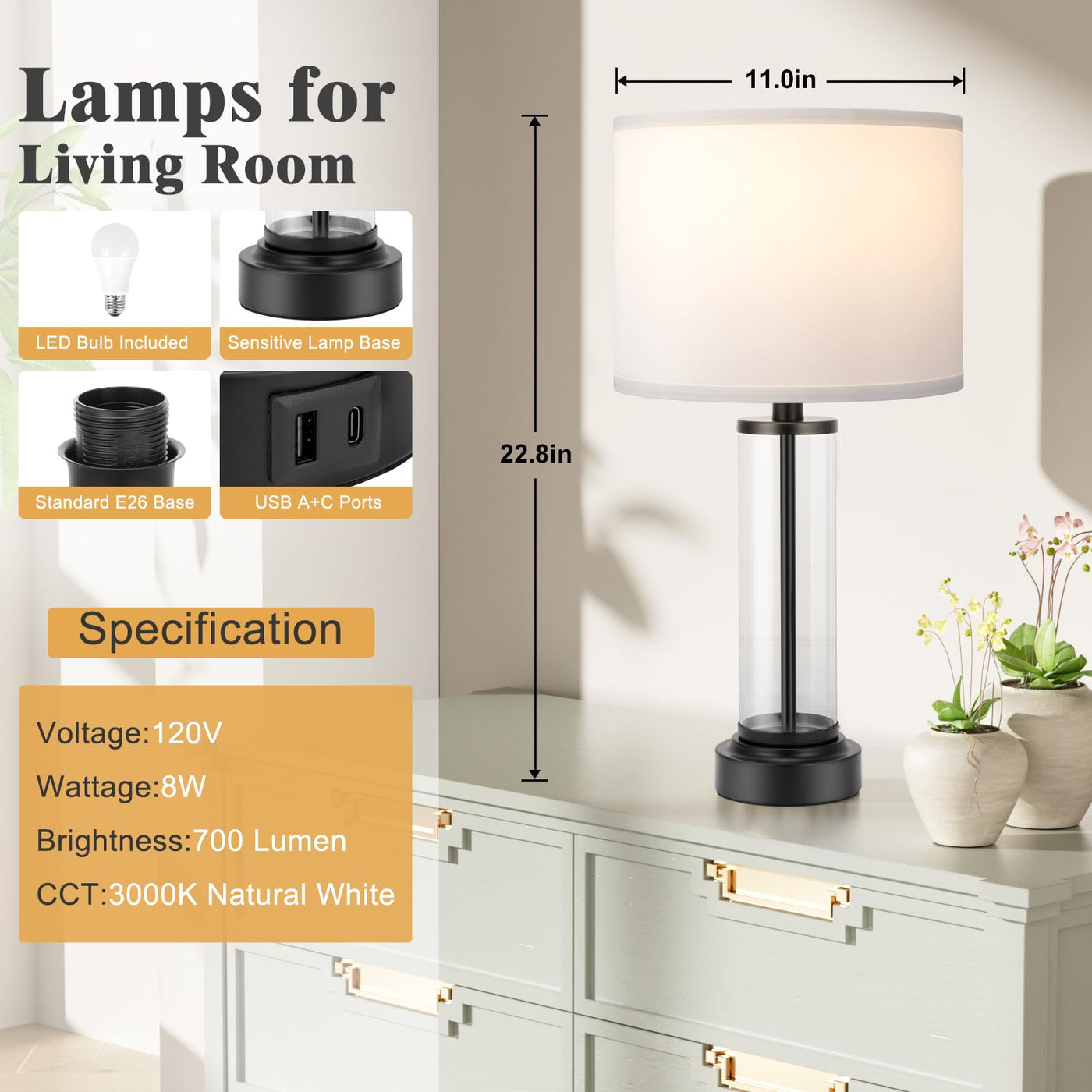 Black Bedroom Lamps Set Of 2 - Touch Bedside Lamp For Night Stands With Usb C+A, 3 Way Dimmable Nightstand Table Lamps For Livin