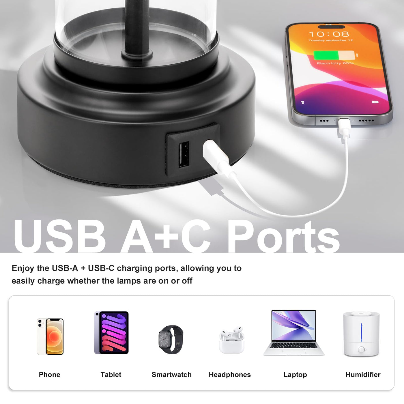 Q: What features do the Black Bedroom Lamps offer?A: The Black Bedroom Lamps come with touch control and three brightness levels (Low, Medium, High), allowing you to adjust the lighting easily to create the perfect ambiance. They also include USB-C and USB-A charging ports for convenient device charging.