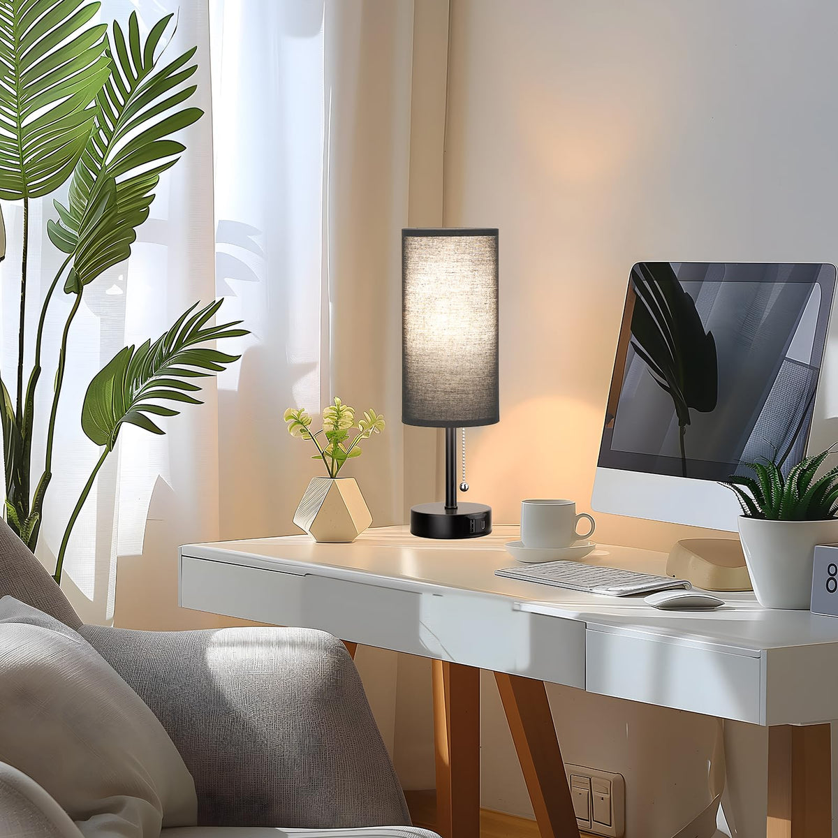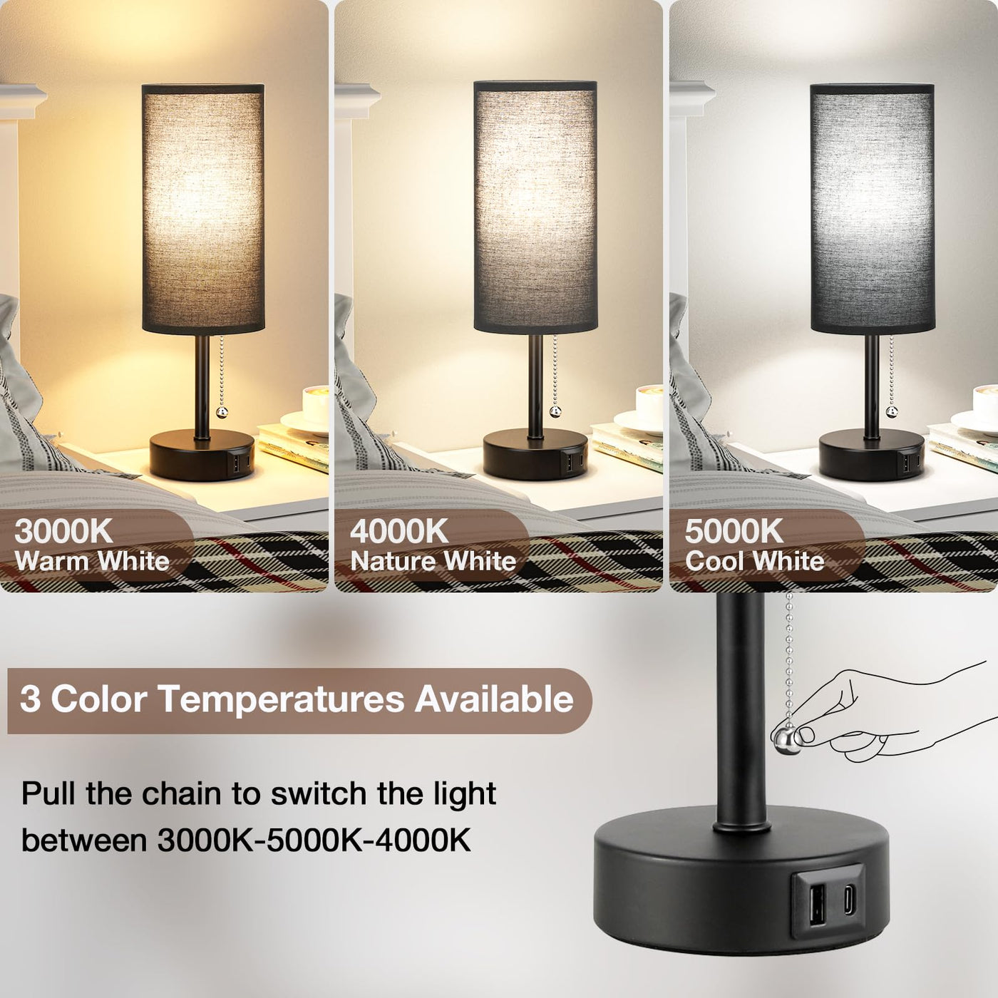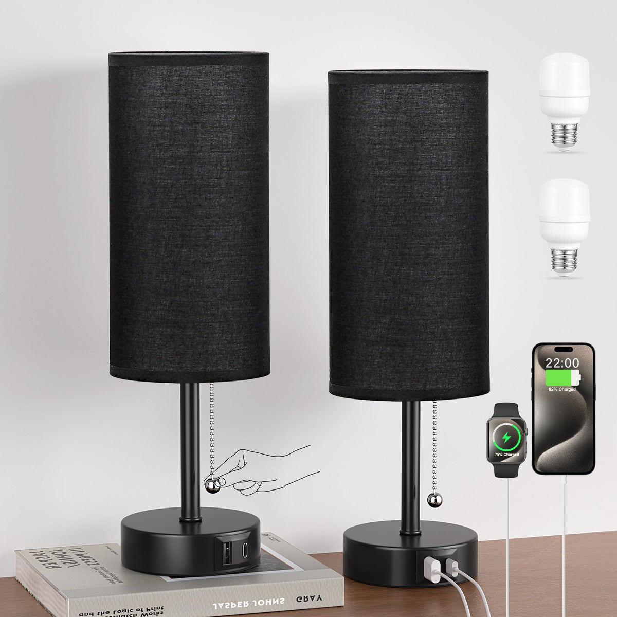 Black Bedside Lamps For Bedroom Set Of 2 - Nightstand Table Lamp With Usb Charging Port, Pull Chain Night Stand Light, Side Tabl