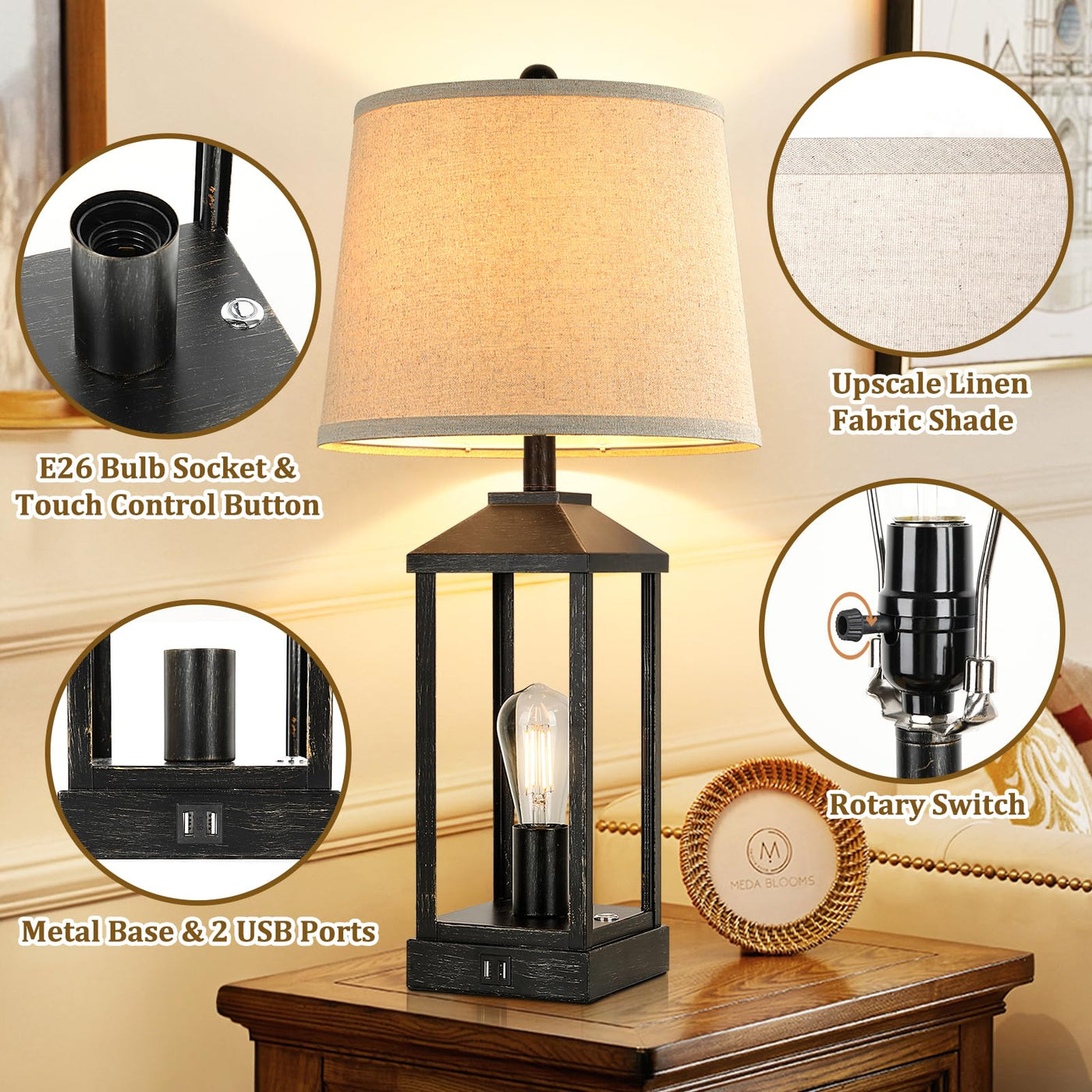 Brightever 28 Inch Farmhouse Table Lamp Set Of 2 With 2 Usb Ports, 3-Way Dimmable Touch Control Farmhouse And Industrial Design Our Living Room Lamp Can Illuminate Your Space Effectively With Its Innovative Top And Bottom Lighting Design, Ensuring A Wider Spread Of Light And Creating A Different Ambiance In Your Room.The High-Quality Linen Lampshade, Combined With A Durable Painted Metal Frame, Not Only Enhances The Lamp'S Durability But Also Adds A Touch Of Farmhouse And Industrial Charm To Your Entire Bedside Table. Rotating Switch& 3-Way Dimmable Touch Control With Its Innovative Touch Switch Design, The Upper Lamp Can Be Turned On And Off Through A Rotating Switch, While The Lower Lamp'S 3 Brightness Levels Can Be Adjusted And Switched On Or Off By Touching The Switch On The Base. You Can Operate Each Bedroom Lamp For Nightstand Independently Or Simultaneously To Create A Unique Visual Experience. 2 Usb Charging Ports The Lamp Bases Are Equipped With 2 Built-In Usb Charging Ports Discreetly On The Side, Allowing You To Conveniently Charge Your Phones And Other Electronic Devices. Whether The Touch Lamp With Usb Is On Or Off, The Charging Function Operates Flawlessly. Specifications: Material: Metal + Fabric Color: White Voltage: 110V~120V Wattage: 60W Max & Led 8W Height: 28'' Bulb Base: E26 Bulb Base Faq: Q: Are The Bulbs All Dimmable? A: No, One Free St64 Bulb Is Dimmable And One Free A19 Bulb Is Non-Dimmable. Q: What If This Table Lamp Is Defective? A: We Brightever Will Always Stand Behind Our Products, If There Is Any Issue With It, Please Feel Free To Contact Us.