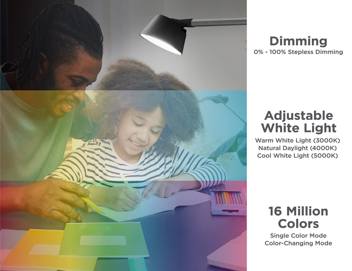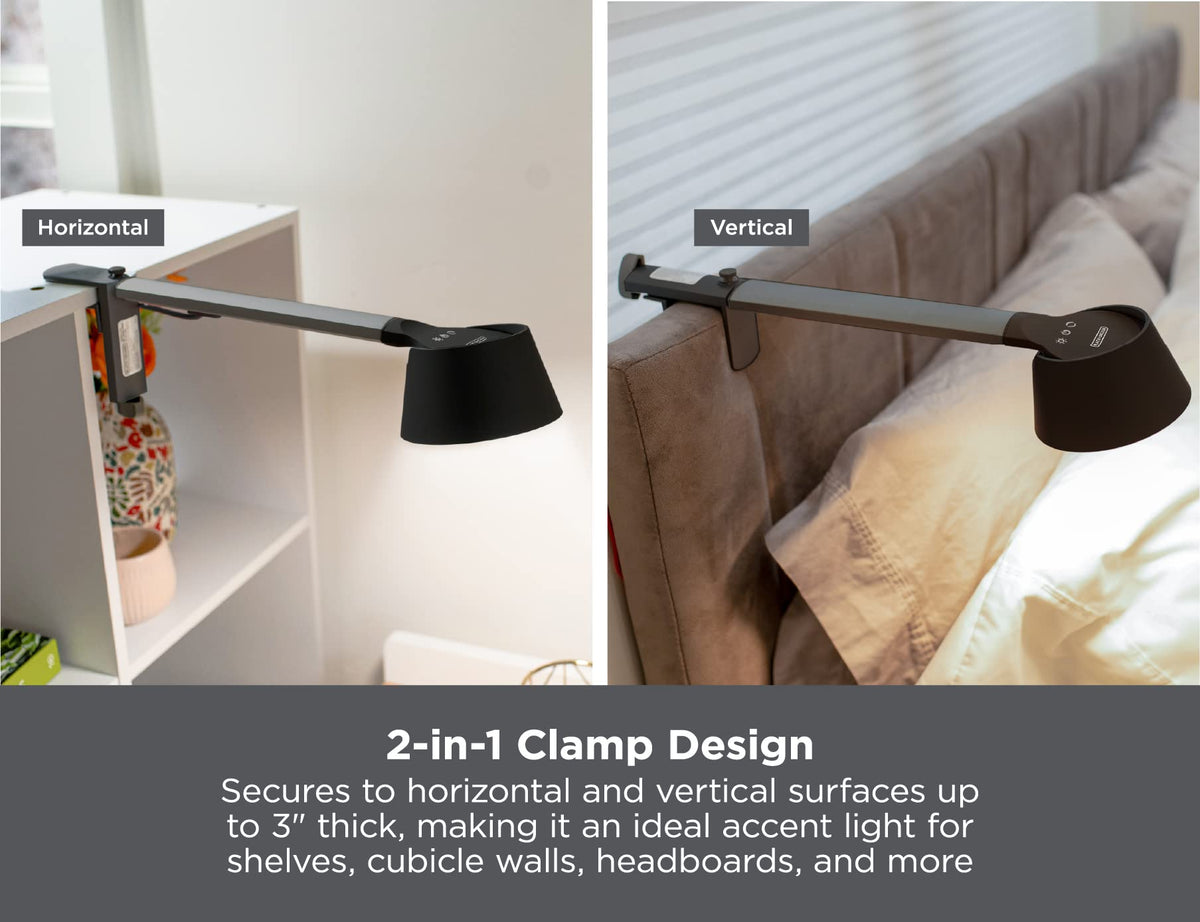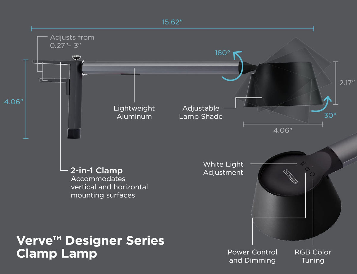 Brilliant Design Meets Convenient Control With Our Black+Decker Designer Desk Lamp With Clamp Base That Seamlessly Brings Light To Your Workspace With Three Touch-Capacitive Buttons That Allow Easy Dimming And Color Adjustment. Durable, Sleek, And Carefully Crafted With Anodized Aluminum Beams For Premium Strength And Durability, Our Verve Designer Series Offers A Range Of Models And Options For Work, Play, And Relaxation. Featuring A Unique, 2-In-1 Design, This Sleek Light Can Be Secured To Vertical Or Horizontal Surfaces Up To 3 Thick, Making It An Ideal Accent For Shelves, Headboards, Cubicle Walls, And More. With Three Points Of Adjustability On The Lamp, Its Design Has Been Tailored For Ultimate Customization, No Matter Where You Need Light. And, You Can Easily Set The Scene For Any Occasion With True White Lighting Or Unwind To A Spectrum Of 16 Million Colors.