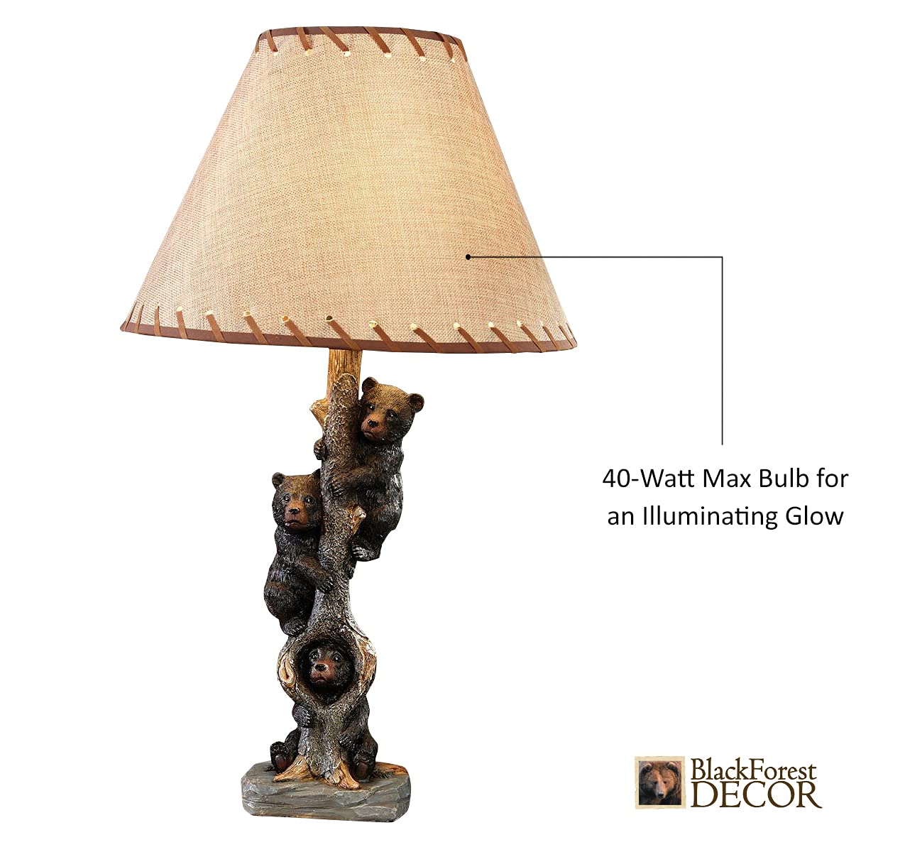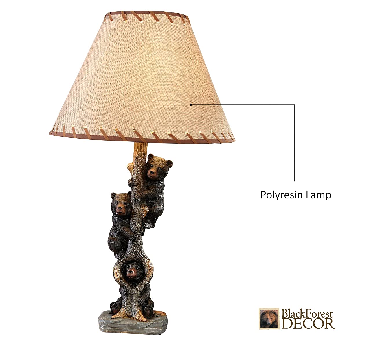 Q: How should I care for this lamp?A: To maintain the Black Forest Décor Bears in a Tree Table Lamp, simply dust it regularly with a soft, dry cloth to keep it clean. Avoid using harsh chemicals or abrasive materials that could damage the finish.