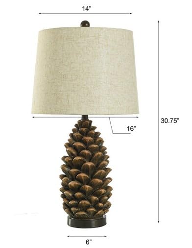 Q: What is the height and size of the Black Forest Décor Rustic Pinecone Table Lamp?A: The Black Forest Décor Rustic Pinecone Table Lamp measures 30.75 inches in height, 16 inches in width, and 14 inches in depth, making it an ideal size for various tables and surfaces in your cabin or home.