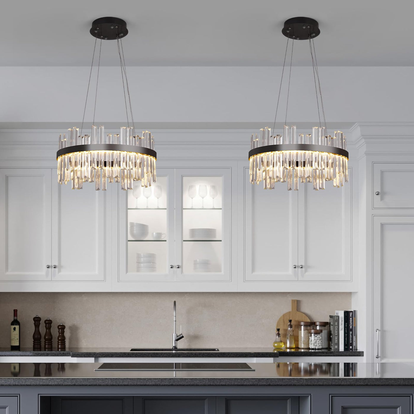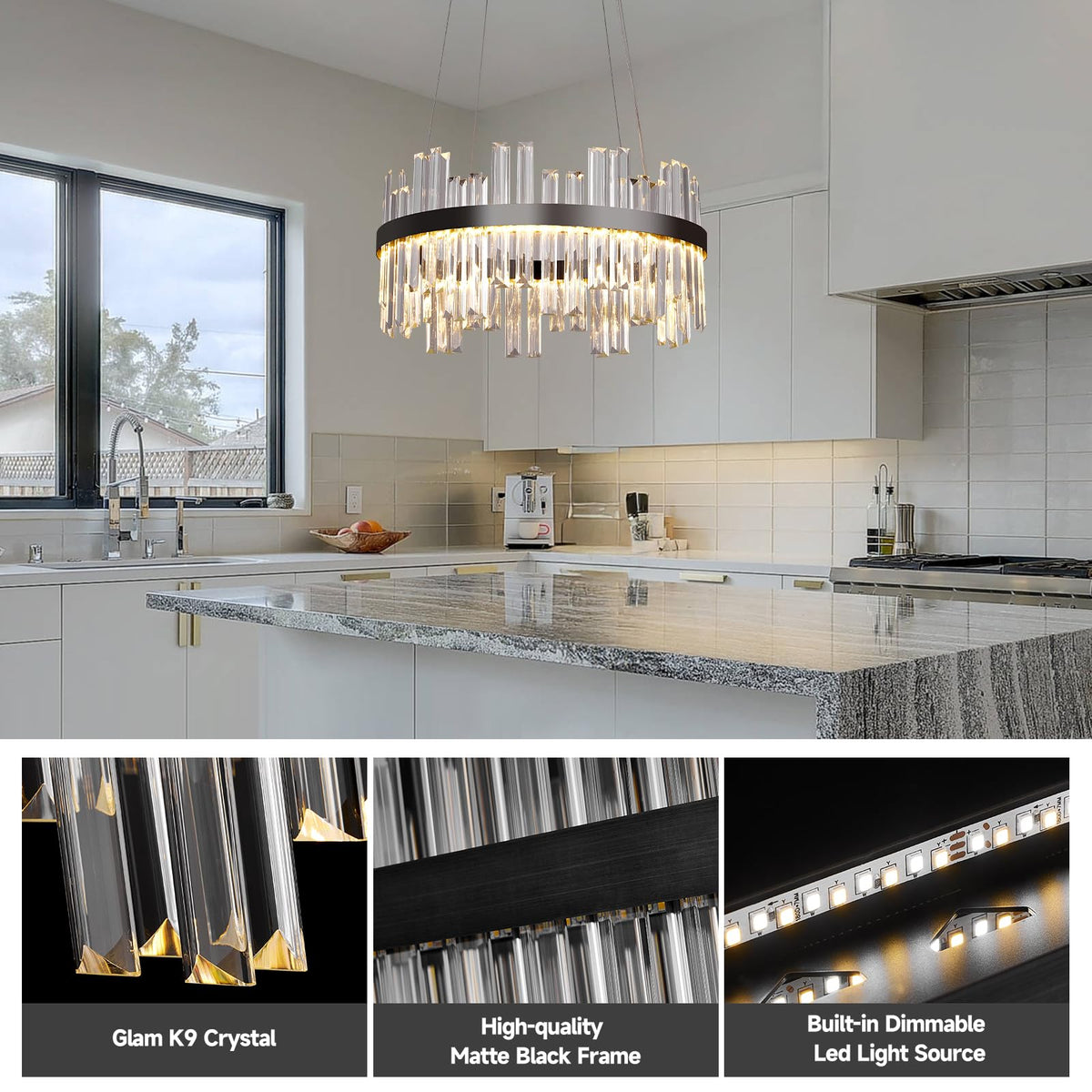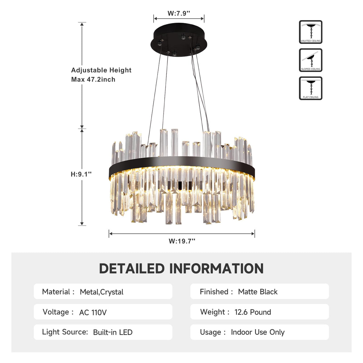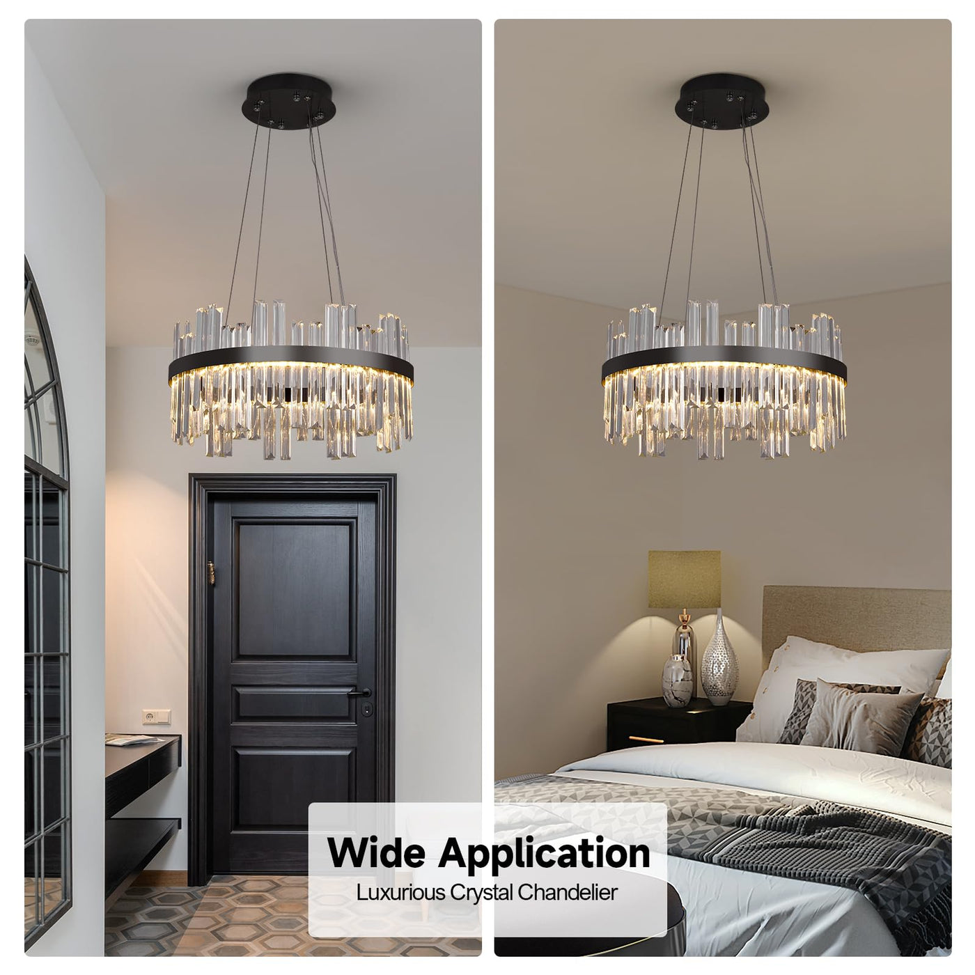 Black Led Modern Crystal Chandelier: 19.7 Round Contemporary 3 Color Dimmable Dining Room Light Fixture Over Table - Adjustable Lighting Chandeliers For Bedroom Living Kitchen Island Entryway Foyer