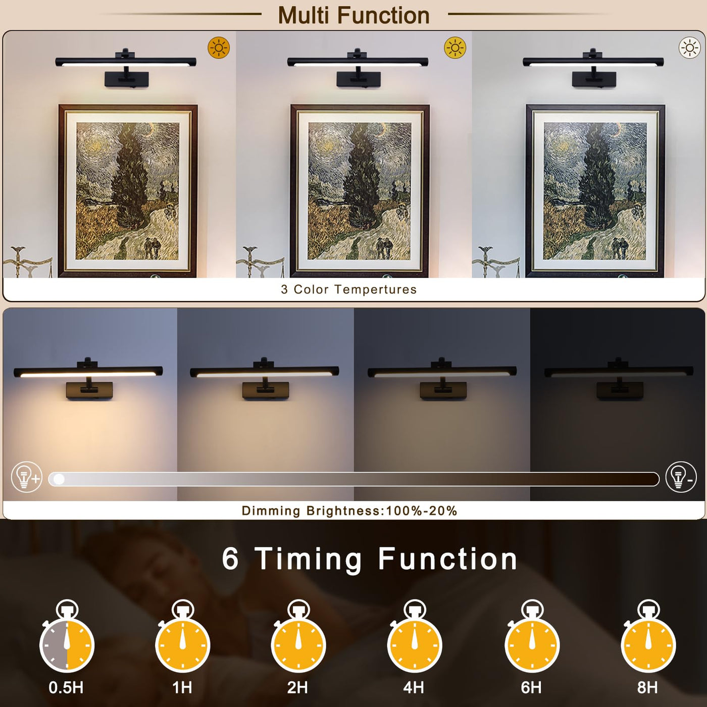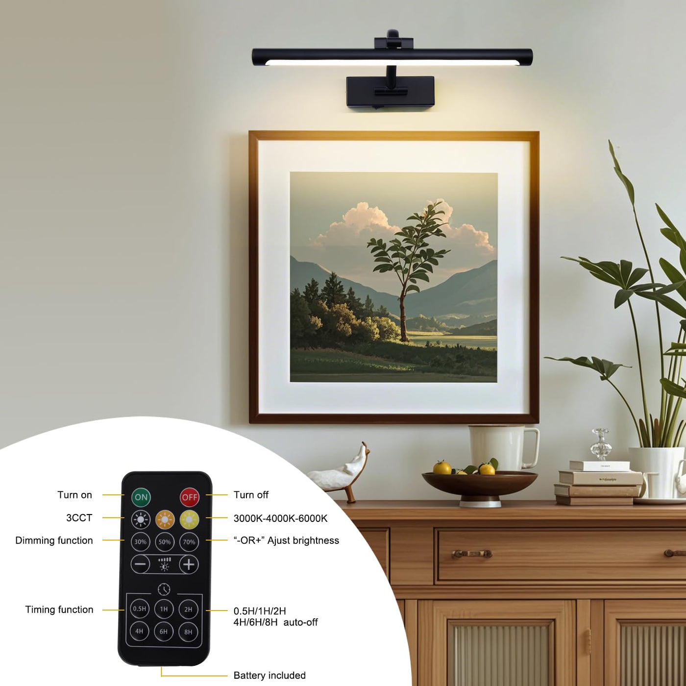 Why Choose Yumcrelect 3W 16&Nbsp;Inch Artwork Light For Wall&Nbsp;Cordless With Remote? 1.180&Amp; 270Rotatable Direct The&Nbsp;Lights For Frames On Wall Precisely Where You Want It. This Cordless Picture Lamps&Nbsp;Can Be Tilted 180-270 To Highlight Your Artwork Or Family Portrait Wall From The Perfect Angle. The Wall Art Lights Is With Adjustable Metal Neck Allowing You To Adjust The Distance From The Wall At Will As A Good Choice Of Battery Operated Wall Sconce. 2.3 Color Temperature Options You Can Choose The Color Temperature Warm White 2700K Natural White 4000K Or Cool White 6000K To Match The Lighting Of Your Space And The Mood You Wish To Create; Allowing You To Meet Various Lighting Needs In Different Settings. 3.Dimmable Brightness 16Inch Spot Light For Wall Art Feature A Dimmable Function Allowing You To Adjust The Brightness From 10% To 100% With Remote Controlto Suit Your Mood Or The Lighting Conditions Of Your Room. 4.Rechargeable Battery Luces Recargables Para Pared Contains A Built-In Large Capacity 5000Ma Battery For Durable Use. Compatible With Universal Type-C Charging Cable(Package Included). ItS Recommended To Use A 5V 2A Charger. 5.Easy Installation And Portable Rechargeable Bathroom Light No Need For Reserved Wires. Just Fix The Bracket On The Wall And Stick The Wireless Picture Sconce To It. Easy To Remove For Charging Every Several Weeks Or As A Portable Use In Various Situations. 6.Full Metal Construction Wireless Rechargeable Gallery Wall Light Adopts enhanced Metal Material And Solid Construction. Anti-Rust Anti-Corrosion And More Durable To Use. The Usb Rechargeable Sconces Wall Lights Is A Great Addition To Your Indoor Home Decor. Specifications: Lumens: 300 Lm Run Time: 60 Hours Power Source:3*Aa Battery( Include) Color Temperature: Warm White (3000K) Nature White (4500K) Cool White (6000K) Lifespan: 30000 Hours Package: 1*Battery Operated Art Sconces With Remote 1*Remote&Nbsp;Control 1*Installation Manual 1*Screw Bag
