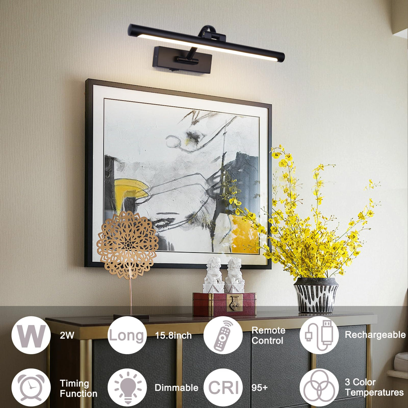 Black Picture Lights Battery Operated 16 Frame Light Rechargeable Gallery Lighting Remote Wireless Art Light For discomfort-reducingting Dimmable Display Lights With Timer Wall Sconce For Portrait Dartboard