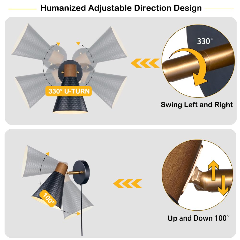 Q: Can I adjust the angle of the wall sconces?A: Yes, the wall sconces feature a flexible adjustable angle. The joint connecting the arm and lamp head can be adjusted up and down by 100 degrees and can also swing left and right by 330 degrees to meet your lighting needs.