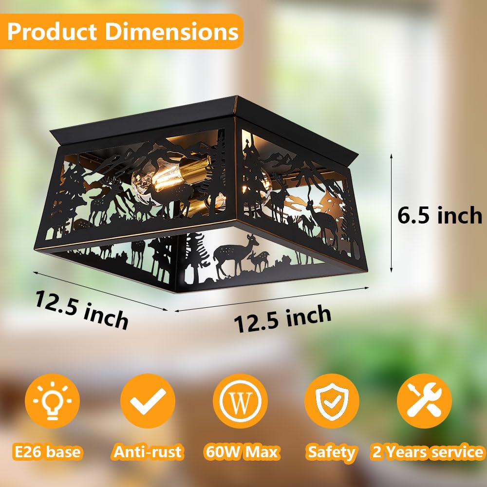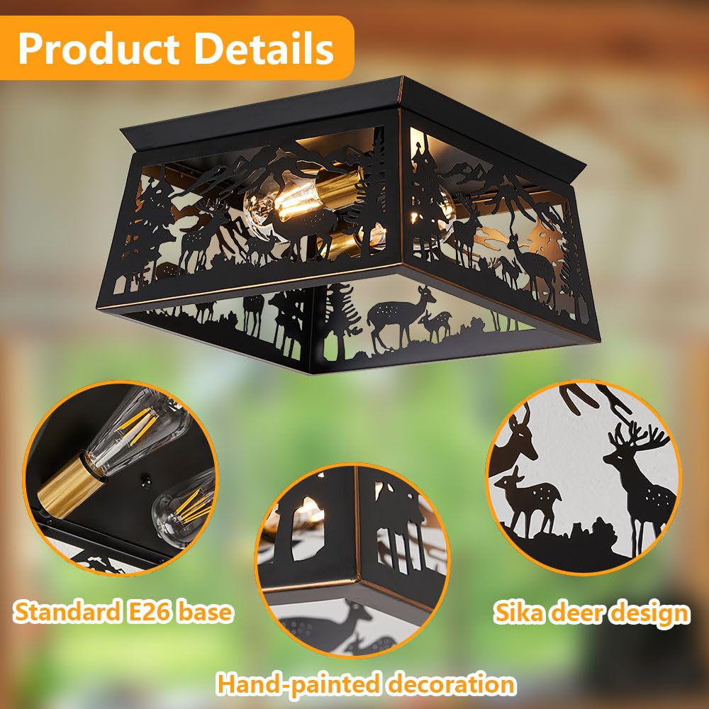 Black Semi Flush Mount Ceiling Light Fixture, Rustic Cabin Deer Ceiling Light Fixture, Metal Country Farmhouse Ceiling Lamp For