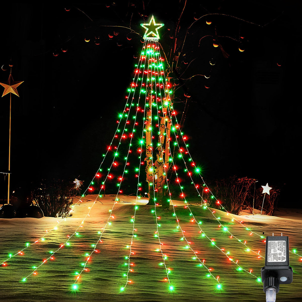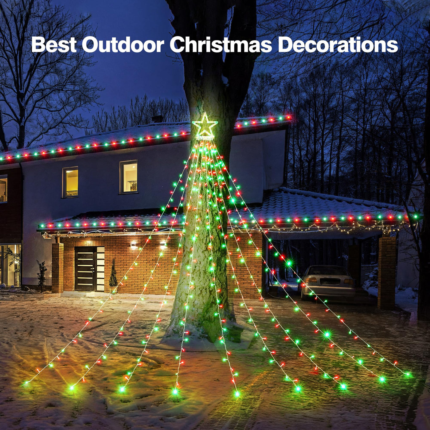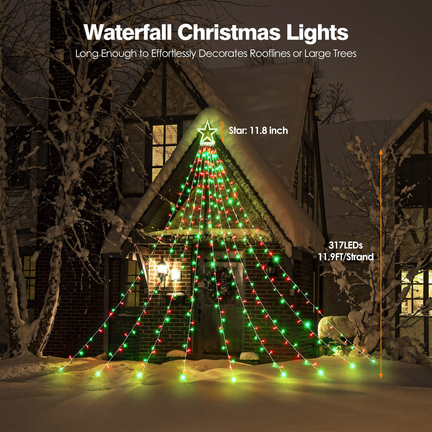 Blctec Outdoor Christmas Decorations 317 Leds Christmas Lights With 9 Strands 11.9Ft Waterfall Christmas Tree Lights 8 Modes Waterproof Topper Star & Timer For Yard Patio Xmas D?Or Red Green