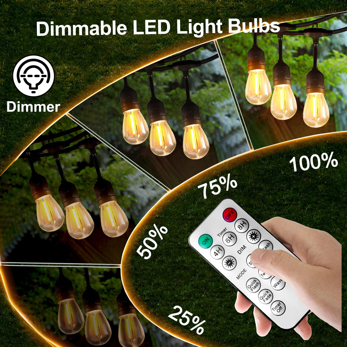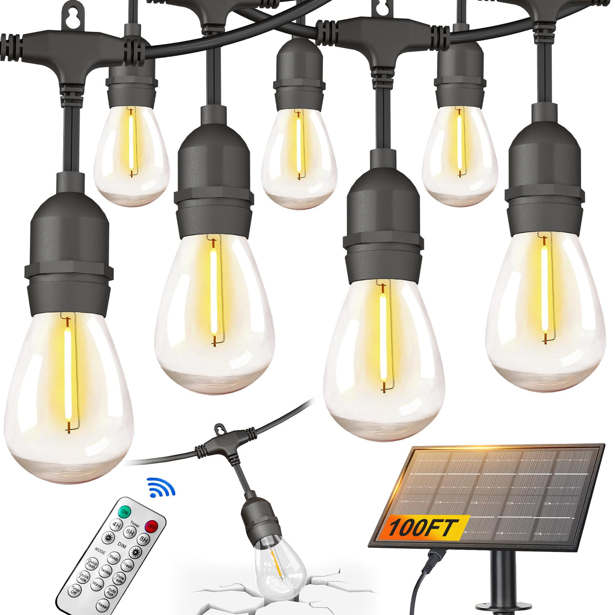 BLIATLUS 100FT Solar String Lights Outdoor Waterproof with Remote Control Solar Patio Lights 30+2 shatterproof LED E26 S14 Bulbs